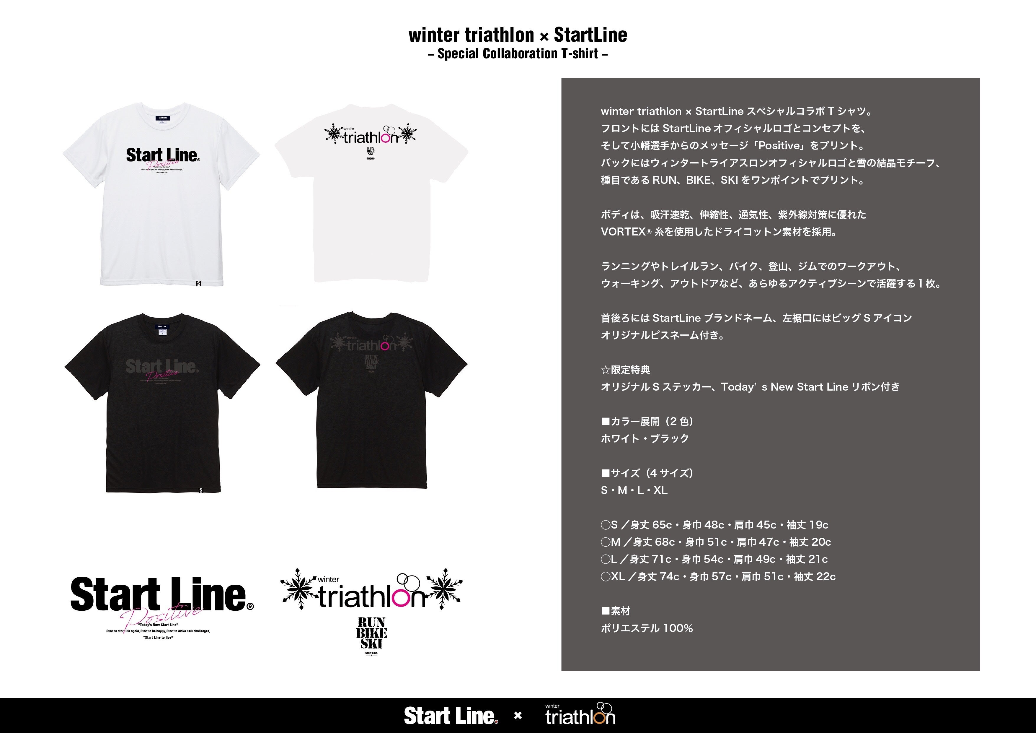 ついに!winter triathlon × Start LineスペシャルコラボTシャツが完成!リターンとして追加致しました。ボディは、吸汗速乾、伸縮性、通気性、紫外線対策に優れたVORTEX®糸を使用したドライコットン素材を採用。これならどんなシーンにでもオシャレに着れますよ^_^タウン、トレラン、ランニング、アウトドアなどこの1枚で何にでも!胸には私からのメッセージ"Positive"(前向き)をプリント。そのルーツは横ノリ青春時代からで常に心掛けている言葉です。皆さんが着ているだけで"前向き"になれますように胸に願いを込めました。胸=心臓=ハート=ピンクで!バックプリントにはツインスターでは無く雪の結晶が!まさにコラボスペシャル!白と黒の2色を用意致しました。サイズはS.M.L.XLとなります。詳細はリターン内容からご確認お願いします。※企業様向けですが、私が練習や大会で着用する今回のコラボTシャツ。会社ロゴをプリントして宣伝するリターンを準備中です。もうしばらくお待ち下さい。