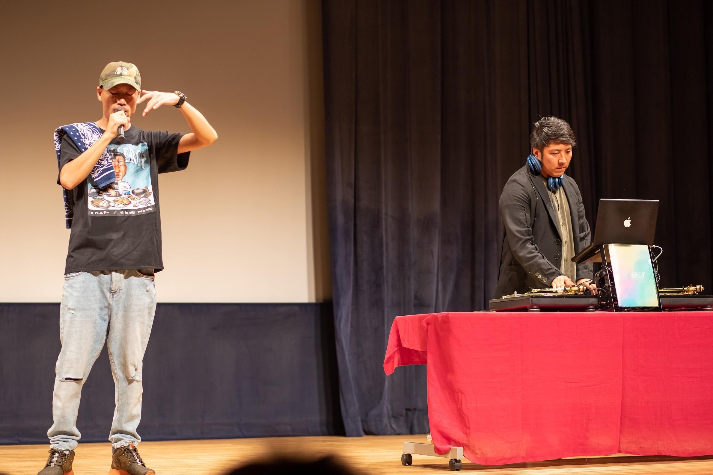 慎The Spilitこと作業療法士の佐々木慎さんと、DJ MINIYONこと作業療法士の田中孝史さんのLIVEパフォーマンス。心書家、河田広樹さんが音楽に合わせて今回の文化祭の「書」を描き上げました。