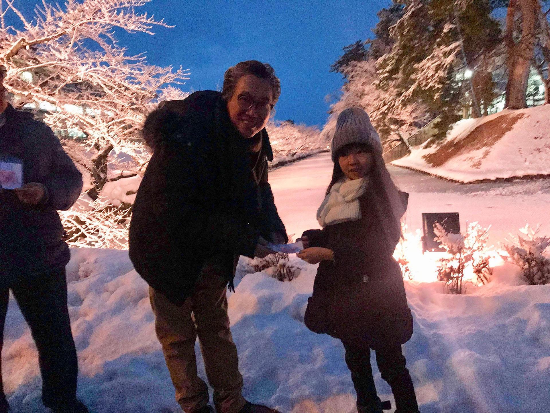青森県青森市で会社員として働くかたわら、春のさくらで有名な青森県弘前市を中心に冬の観光を盛り上げようと活動させていただいている「冬に咲くさくらライトアップ実行委員会」の代表の米山(写真中央)と申します。