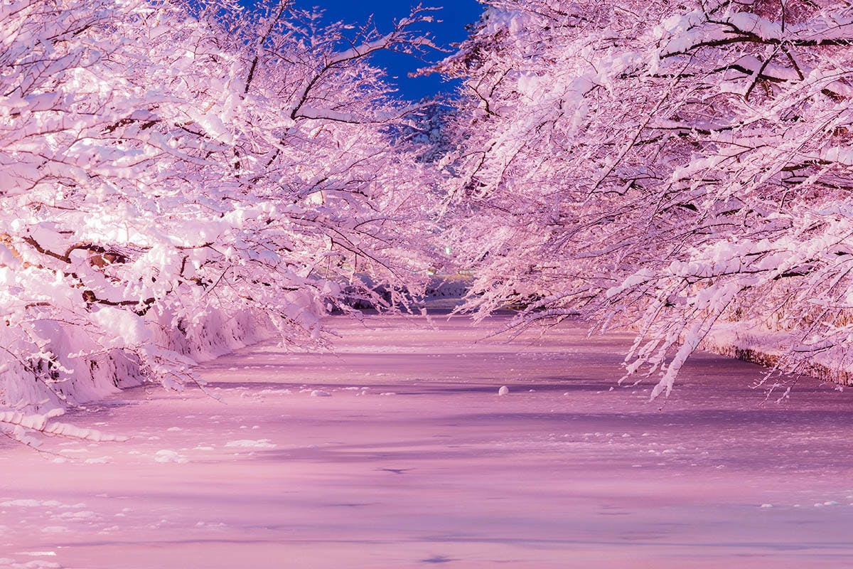 ※本ライトアップの「見頃」は、さくらの枝に雪が綺麗に降り積もった日になります。また、時間帯によっても見え方が変わります。そのため、必ずしも↓のような光景が見られるとは限りません。
