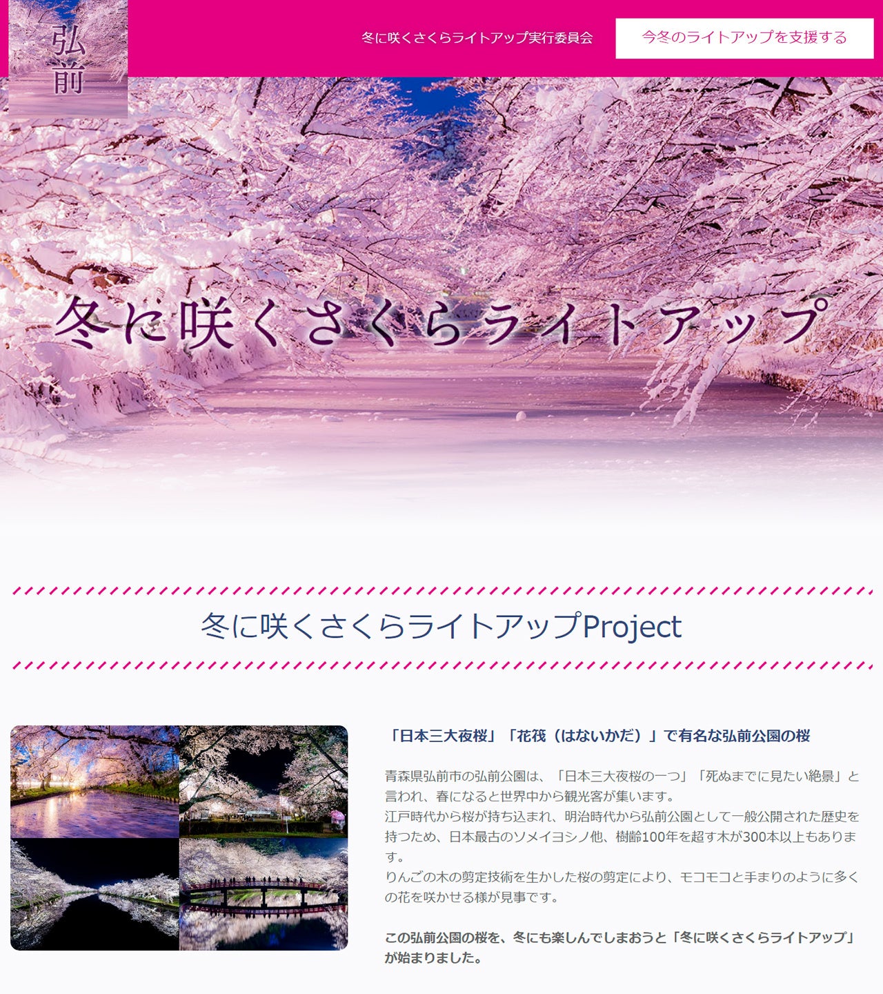 プロジェクトオーナーの米山です。いつもご支援いただき、大変ありがとうございます!さて、今回のお知らせは…本プロジェクトの公式Webサイトができました!冬に咲くさくらライトアップ--弘前冬桜これまではクラウドファンディングのプロジェクトページをご覧いただく形だったのですが、本プロジェクト3年目にして1つにまとめることができました。内容は・本プロジェクトを始めたきっかけ・2017年度のプロジェクトや、ライトアップ実施の様子・2018年度のプロジェクトや、ライトアップ実施の様子・よくあるご質問などです。もちろんスマホ対応も行っています!そして、ライトアップの「見頃」はいつ?や、これまでご参加、ご協力いただいた方なども掲載していますよ!ライトアップの開始までにもコンテンツを追加していきますので、更新もお楽しみに!ちなみに、この公式Webサイトをお作りいただいたのは…青森県弘前市で事務代行、ライティング、IT活用支援をされているさいとうサポートの斎藤美佳子さんです!素敵にデザインいただき、本当にありがとうございます!ただいまはライトアップ実施に向けての準備のほか、夜の弘前をより楽しんでいただくための一助としていただくための「夜のまち歩きマップ」等を進めております。引き続き本プロジェクトへのご支援や、SNS等へのご拡散をよろしくお願いいたします!
