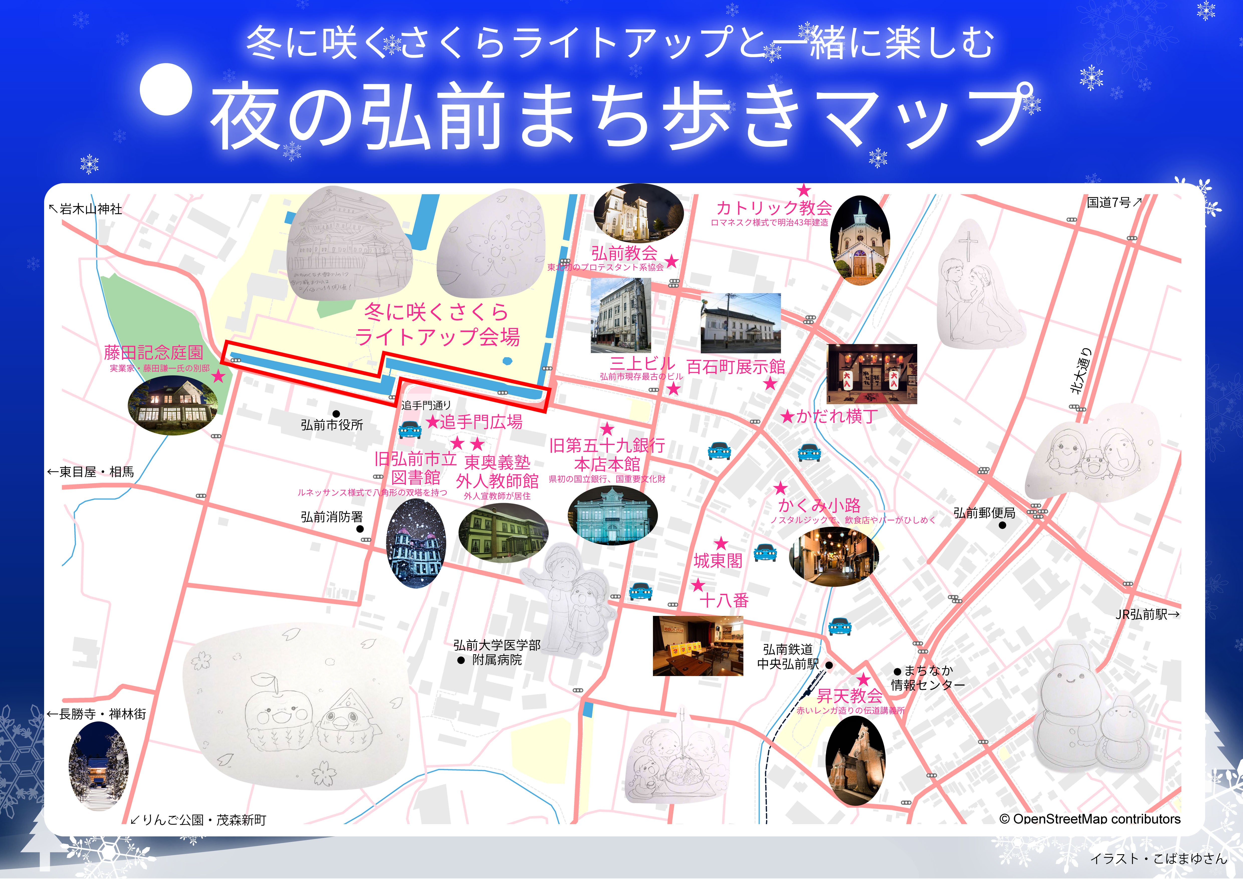 プロジェクトオーナーの米山です。お世話になっております。先日発生した、台風19号による日本各地の甚大な被害に心を痛めております…私としては、僅かばかりですが「【令和元年 台風19号】緊急災害支援金」へ支援させていただきました。困った時こその助け合い、ですよね。話変わって、おかげさまで本プロジェクトのご支援が約60%となりました。大変ありがとうございます!残り期間が約2週間となりましたが、最後までご支援のほど何卒お願いいたします。さて、「冬に咲くさくらライトアップ」の開始時から・ライトアップ会場の場所が分かりにくい!・ライトアップ以外で楽しめる場所が分かればいいのに…というご意見をいただいておりました。私としても、不案内を改善したく思っていましたし、弘前はまち自体がとても面白いと思っていますので、何ができるかを考えていましたが…貼付画像の通り「夜の弘前まち歩きマップ」を作成することとしました!まだ完成していませんが、↓↓のような感じです!イラストが8点入っていますが、こちらは地元イラストレーターの「こばまゆ」さんにお書きいただいています!ありがとうございます!「夜の弘前まち歩きマップ」の完成品ではイラストに色が付くうえ、さらに見やすくさせていただきます!完成した「夜の弘前まち歩きマップ」は、ライトアップ会場周辺の観光案内施設や公式ウェブサイト等での無料配布を予定しておりますので、お越しいただける際はご参照いただきつつ、弘前のまちをお楽しみいただけると幸いです!繰り返しになりますが、本プロジェクトの募集は10/30(水)までとなっております。どうぞ最後までご支援や、SNS等へのご拡散を何卒よろしくお願いいたします!