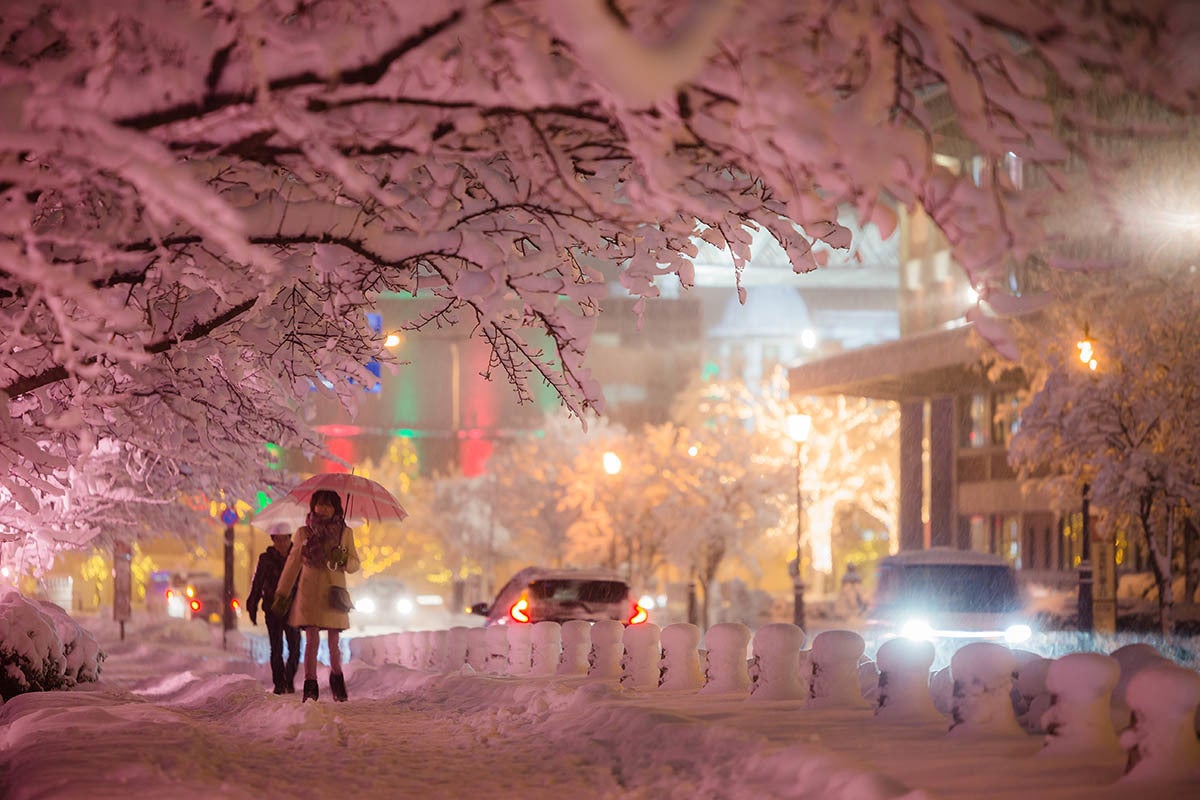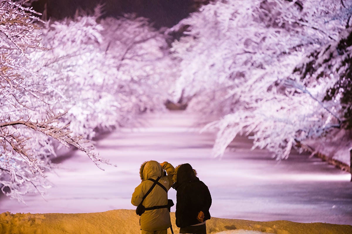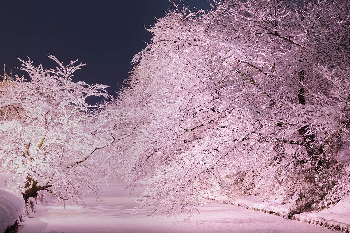 ※本ライトアップの「見頃」は、さくらの枝に雪が綺麗に降り積もった日になります。また、時間帯によっても見え方が変わります。そのため、必ずしも↓のような光景が見られるとは限りません。
