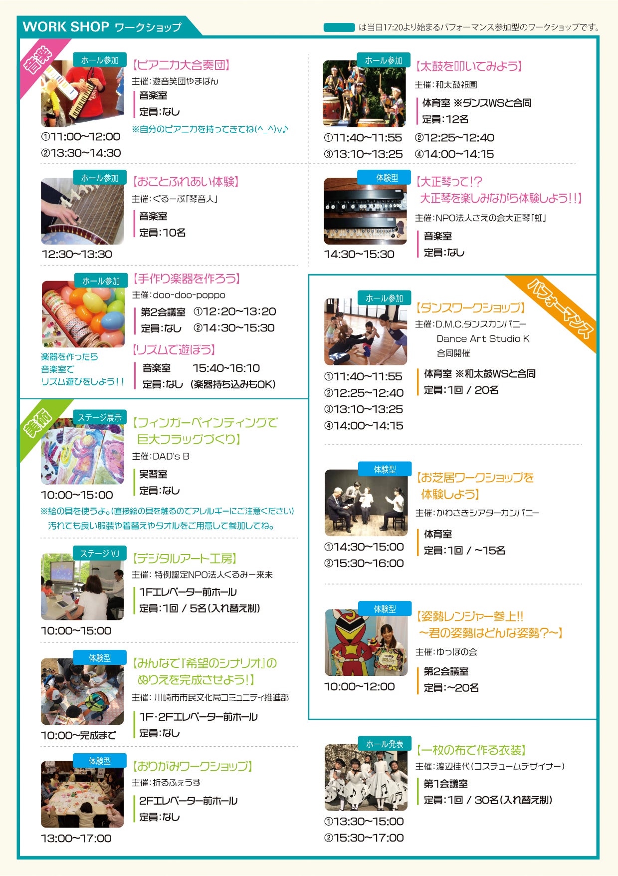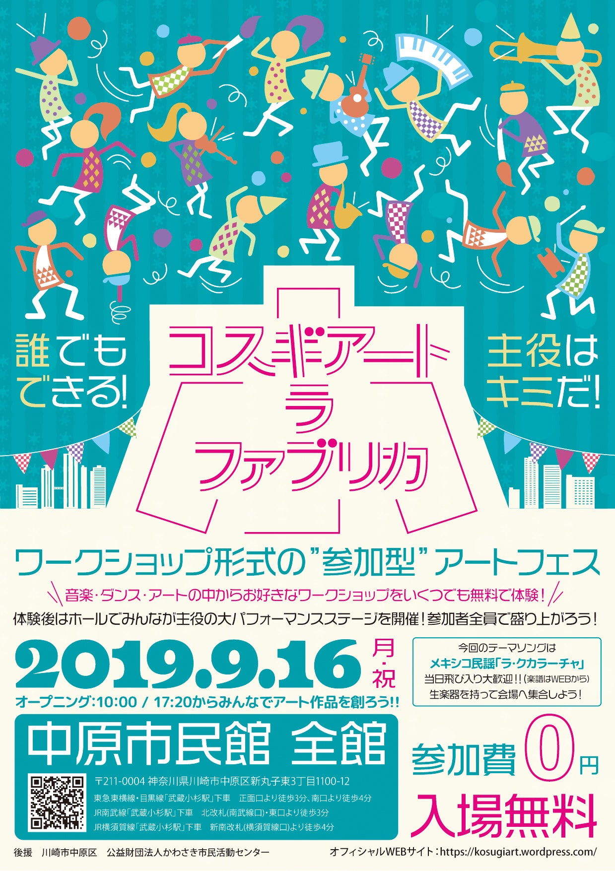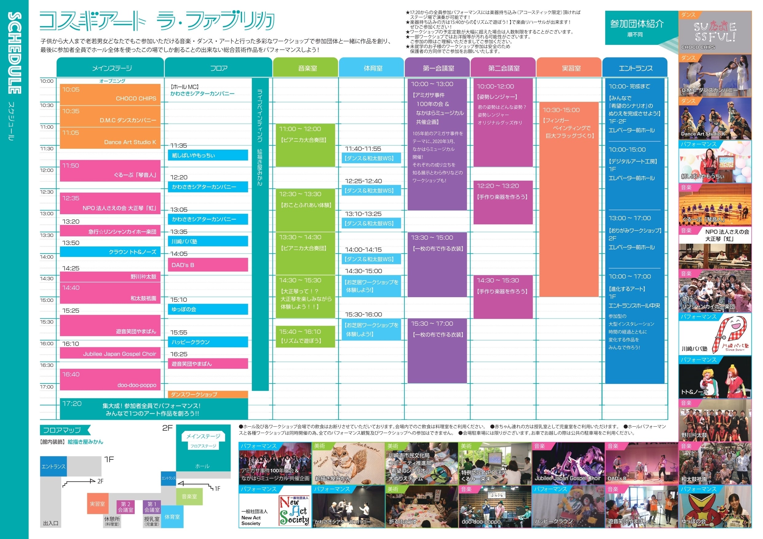 このイベントは、中原市民館のある「武蔵小杉」を中心に、地元で活動を続ける文化芸術関連の市民団体が共同で開催する「来場者参加型のアートフェスティバル」です。イベントの核となるのは「体験ワークショップ」と、最後にそれらを全て繋ぎ合わせた「参加者全員での大パフォーマンスライブ」です。