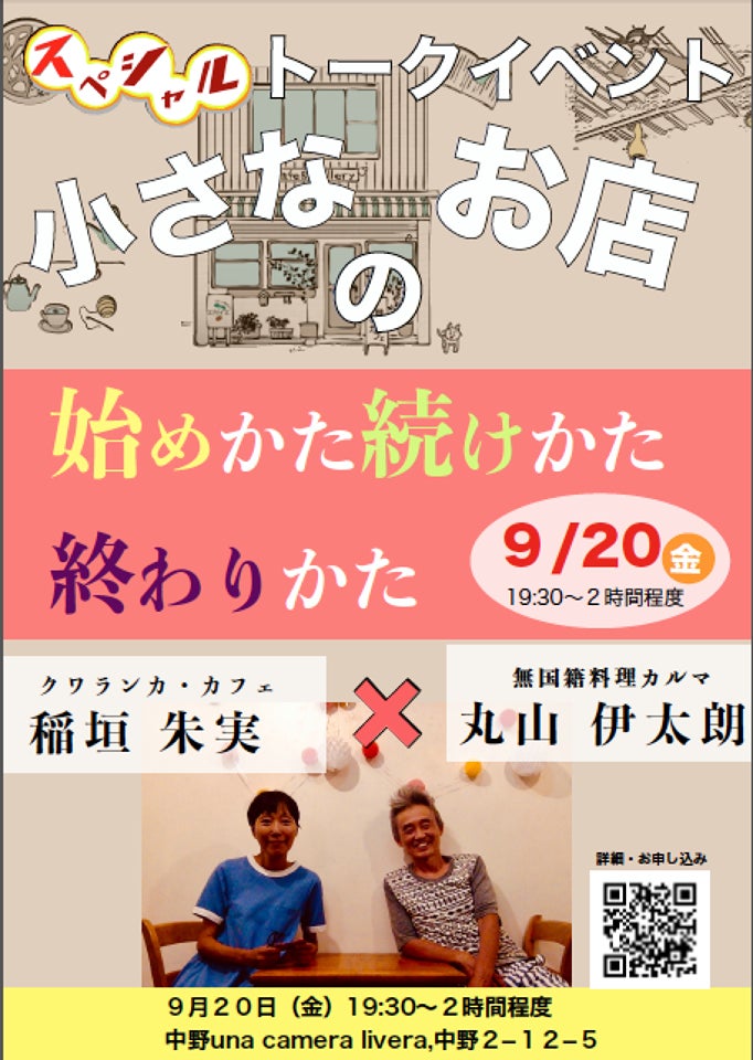 先日、9/20にuna camera livera にて、稲垣朱実さん(クワランカ・カフェ)をお迎えして「小さなお店の始めかた続けかた終わりかた」というテーマでトークショーを開催いたしました。