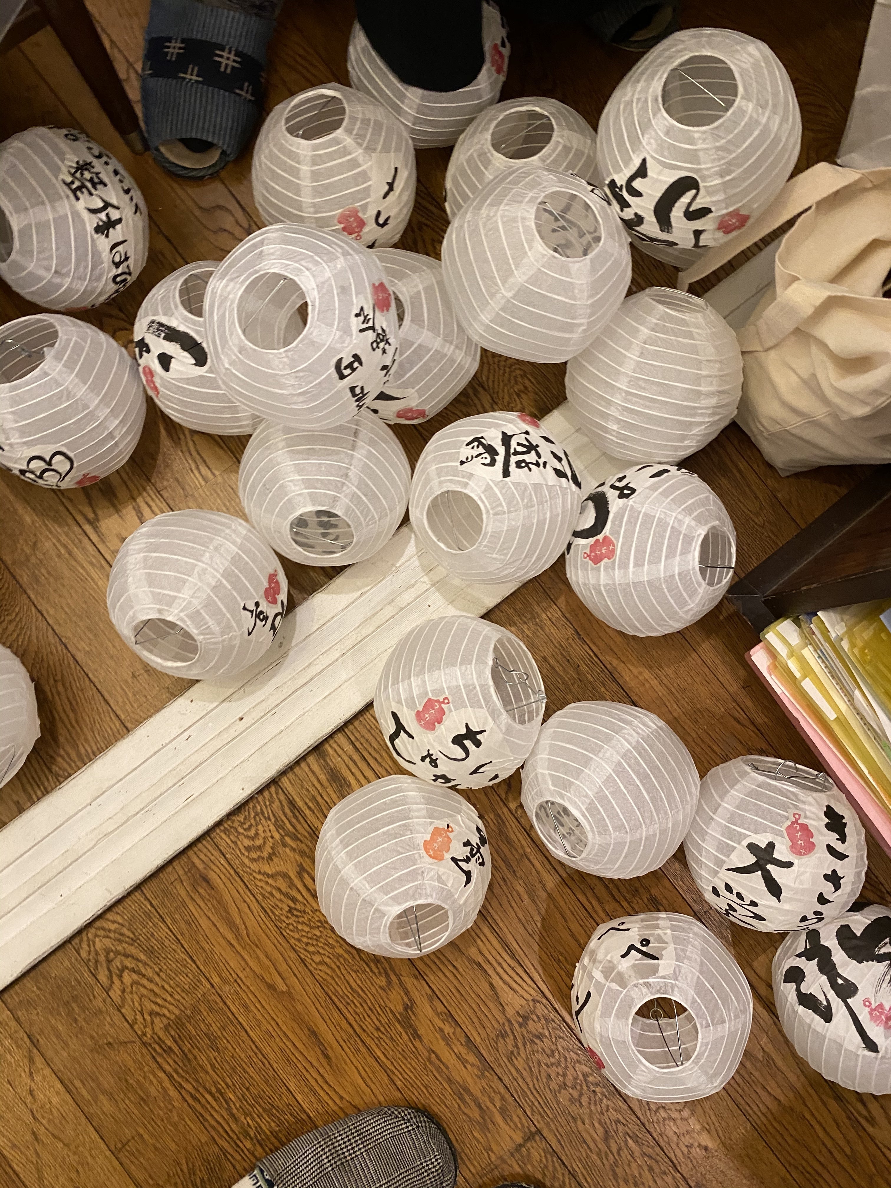 リターンの小さな提灯完成。立花由香さんの書でお名前入れさせていただき、だんだん店内に点っていきます。