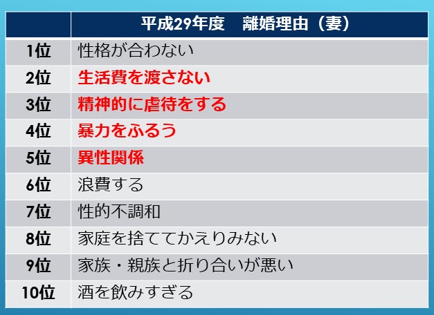 平成29年度の妻側の離婚理由に見られる2位~5位が