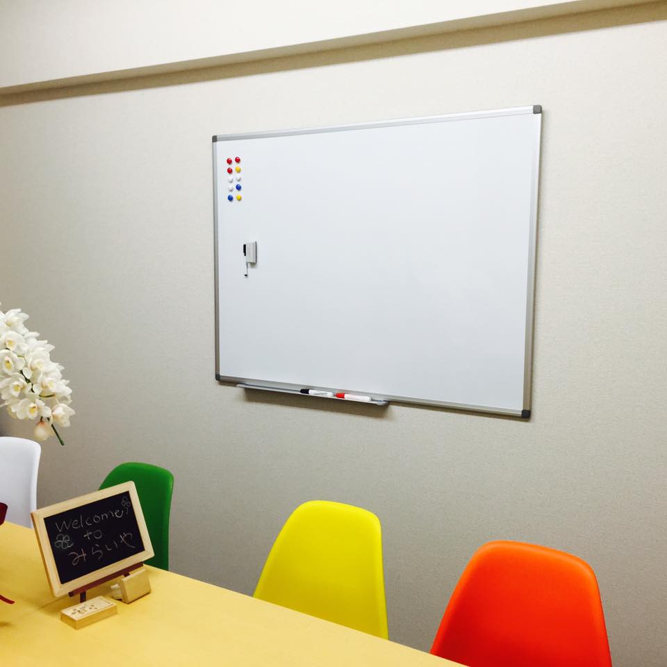 ホワイトボードは入り口すぐ右手と、右側の壁の両方に掲げることができます。