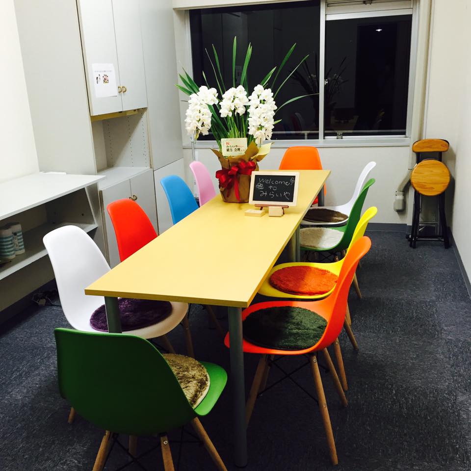 おかげさまでみらいやの内装がほぼ完成いたしました!夜なので写真が暗いのが残念ですが、あとはカーテンの取り付けと、壁に装飾用のウオールステッカーを貼る予定です。