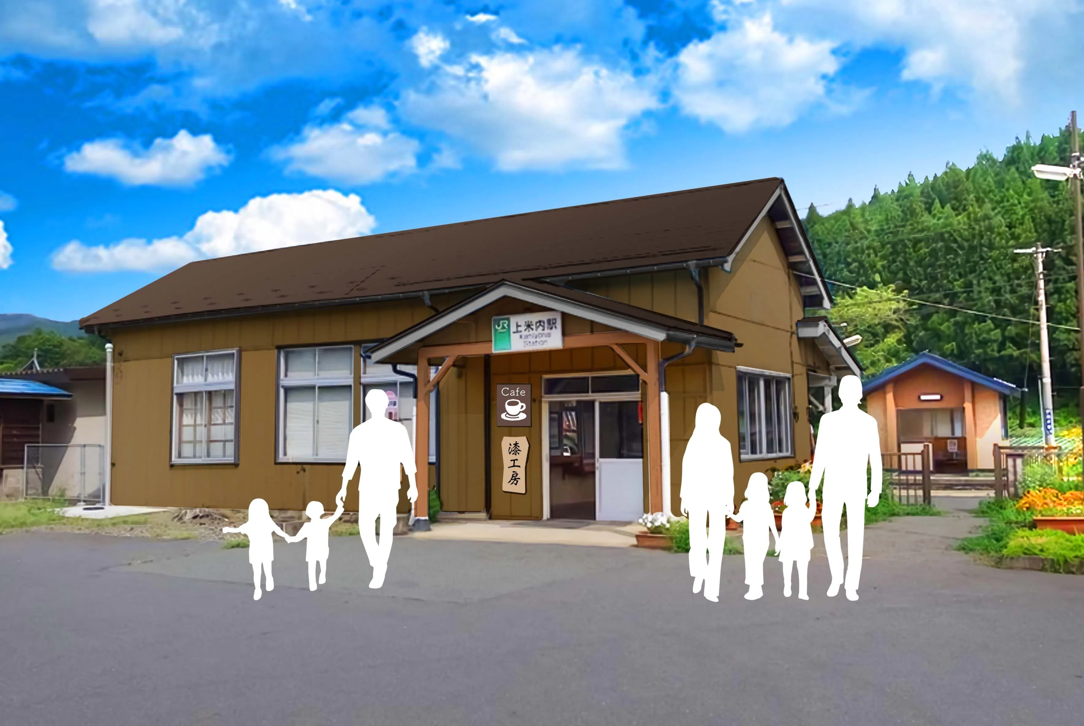 【待合カフェ + 駅前広場 + 上米内マルシェ + 漆工房】4つのゾーン