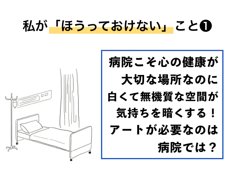 このプロジェクトは、私自身が感じた「ほうっておけないこと」を解決するために行います。私の夢である”アートで溢れる病院”を目指した第一歩として全力でプロジェクトを進めていくので、ぜひご支援よろしくお願いいたします!