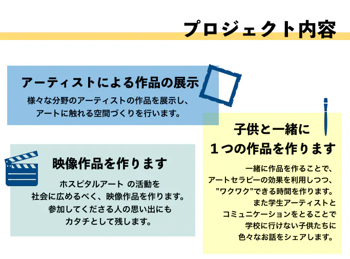 今回のホスピタルアートプロジェクトでも、ドキュメンタリー映像を作成し、社会にホスピタルアート の必要性を訴えます。