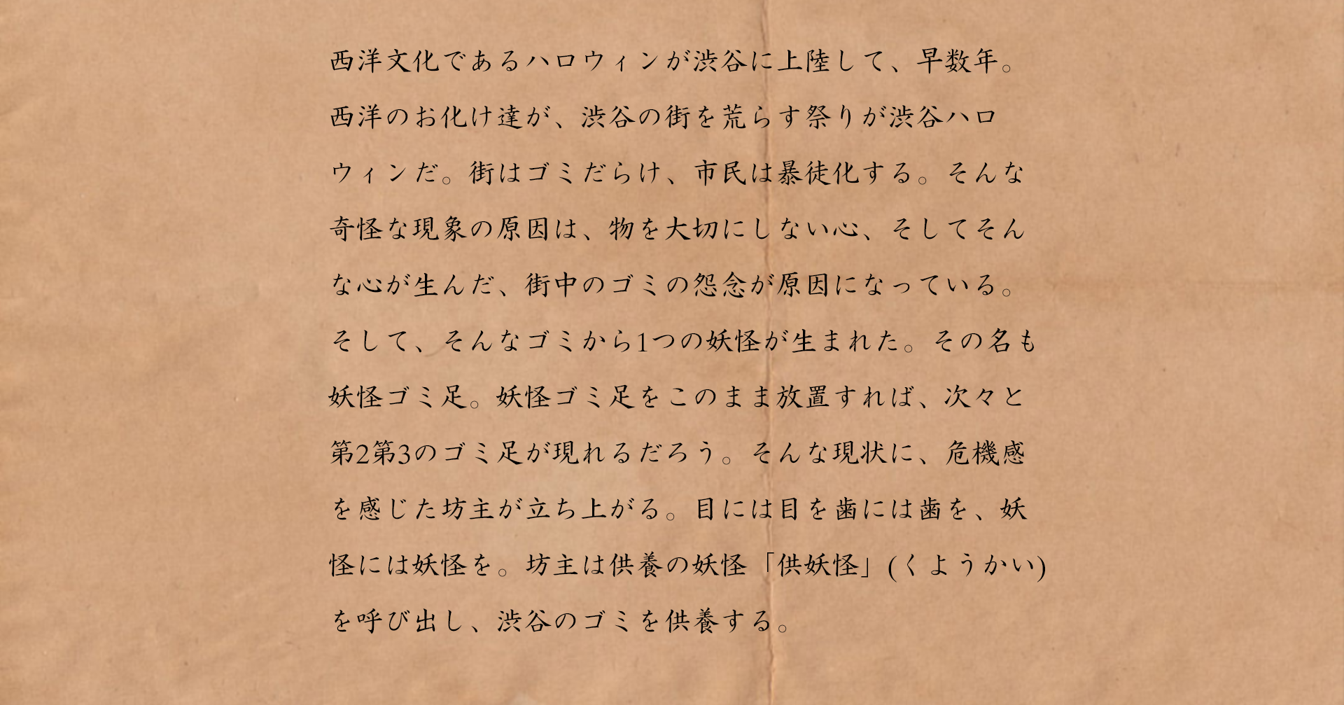 そこで渋谷ハロウィン翌日の早朝に、ゴミを集め供養するというパフォーマンスを本物のお坊さんとオリジナルの妖怪で行うことで、忘れ去られた、物を大切にするという心をくすぐることでゴミ問題に一石を投じます。