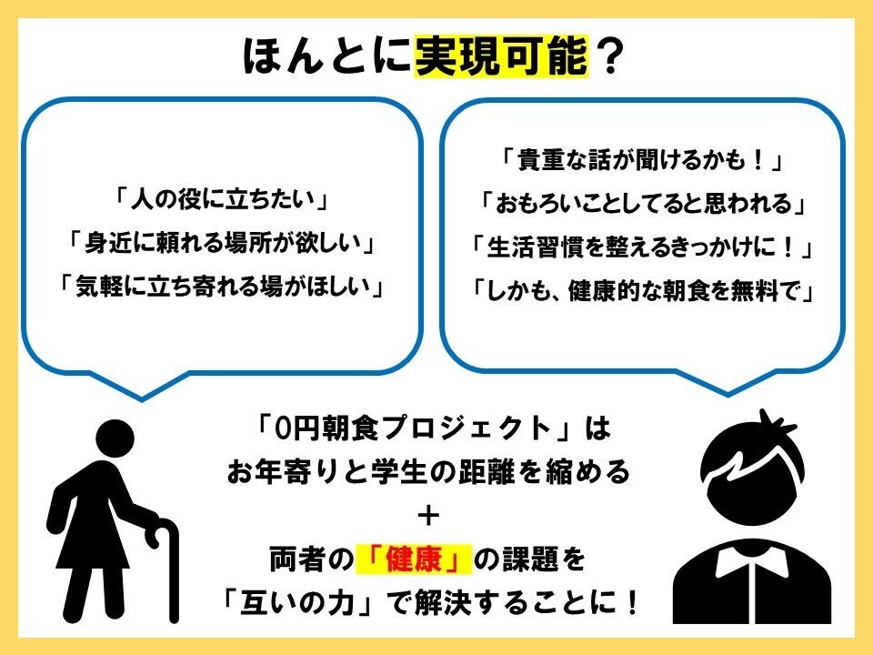 この「0円朝食プロジェクト」では、お年寄りの方が持つ「精神的な健康」と若者が持つ「生活習慣による健康」のそれぞれの課題をお互いのチカラで解決できます。このプロジェクトに参加することは、双方にとって大きなメリットがあり、実現可能性は高いと判断します。