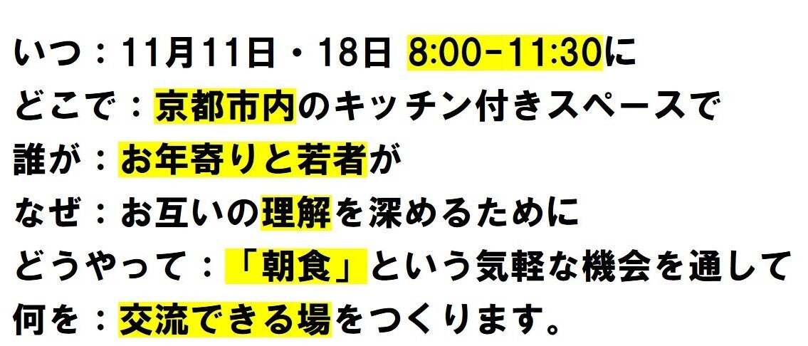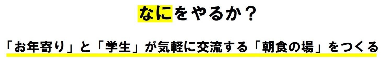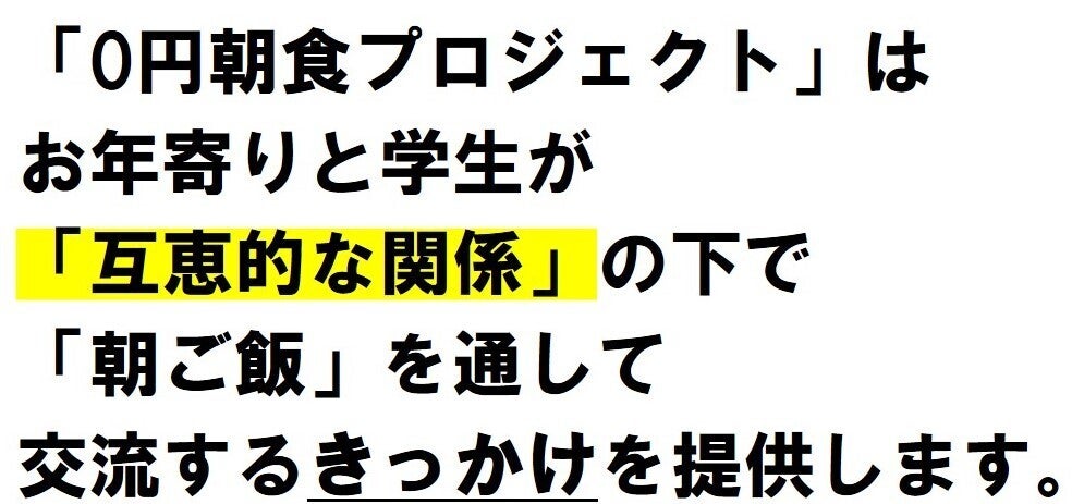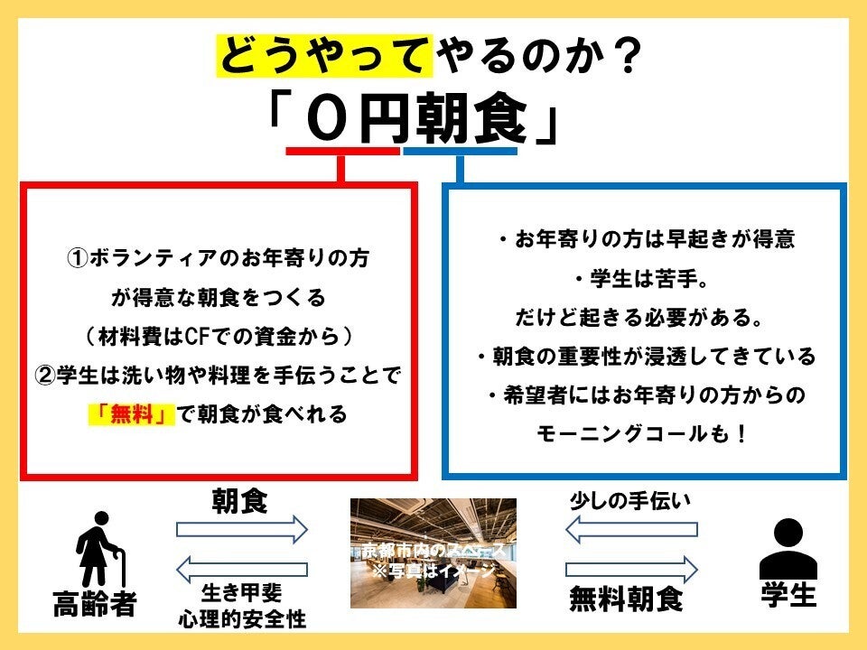 「0円朝食プロジェクト」と題し、お互いにとってハードルが低い「朝食」という形を通して学生とお年寄りを繋げるプロジェクトで、イベント形式で行います。参加可能なのは、原則お年寄りと学生のみで、朝食招待券を持つ人は特別に参加可能です。