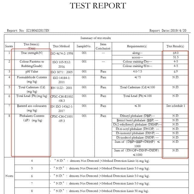 摩擦による耐久性や色落ち、引張り強さ、有害物質が含まれているかなど複数検査したところ、全て検査基準を上回っており、有害物質も含まれていない安全な素材であることを確認しております。