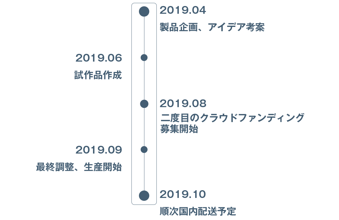 本製品は量産に一切の問題はなく、プロジェクト成立移行はできる限り早くお手元に届けられるよう努力いたしますが、想定を上回る大量のご注文時や素材供給に時間が必要な場合など予期しないトラブル、また物流事情などで遅延が発生する場合がある点についてはご留意ください。
