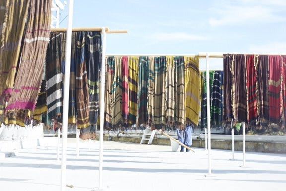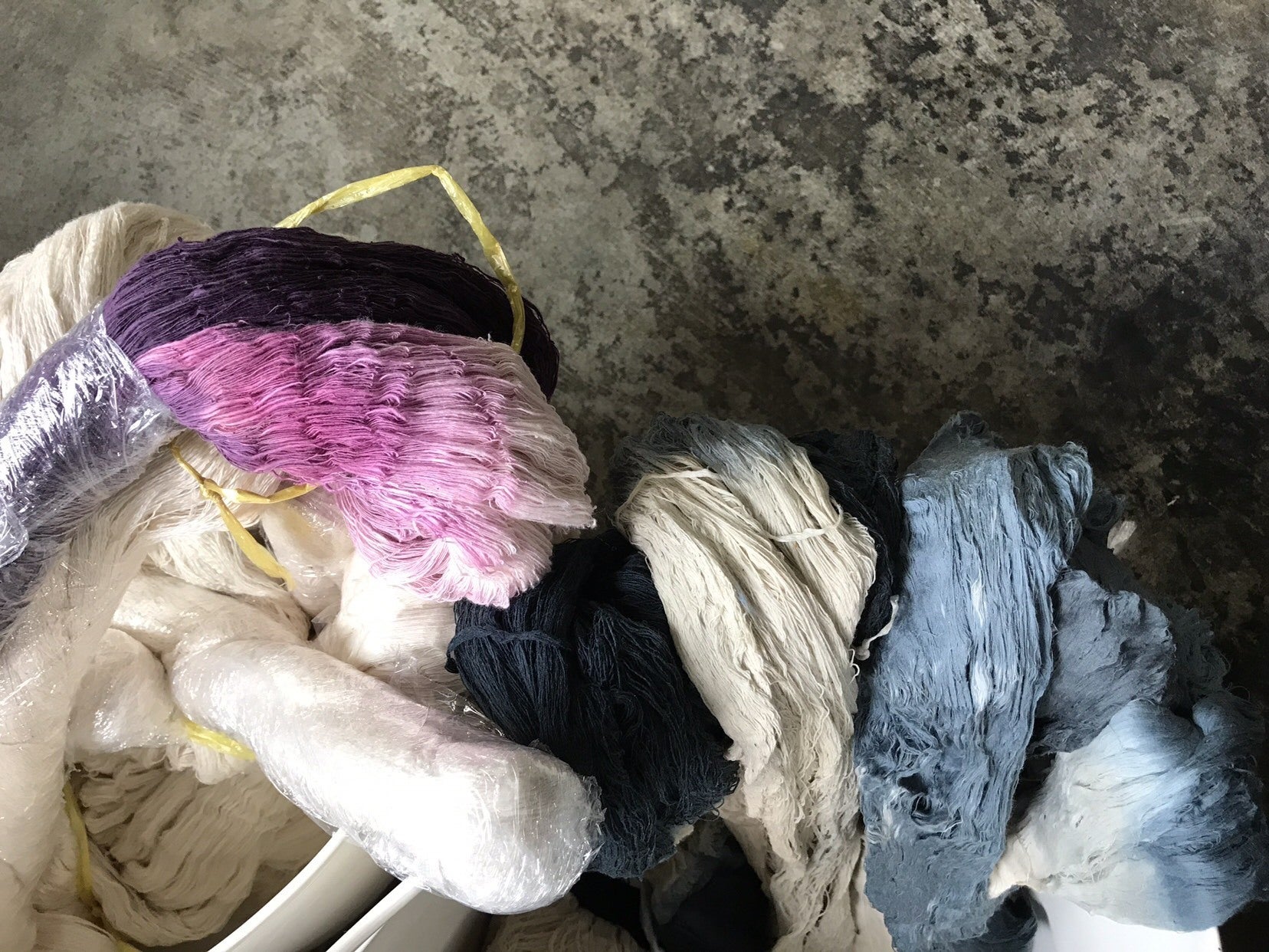 ラップを巻き、防染することでムラ染めができます。ムラ染めを織ることによって、タテとヨコにできるチェックの織柄だけでなく、斜めに入る模様が出来上がります。そうすることで柄は増え、一点一点に違った雰囲気をだすことができます。