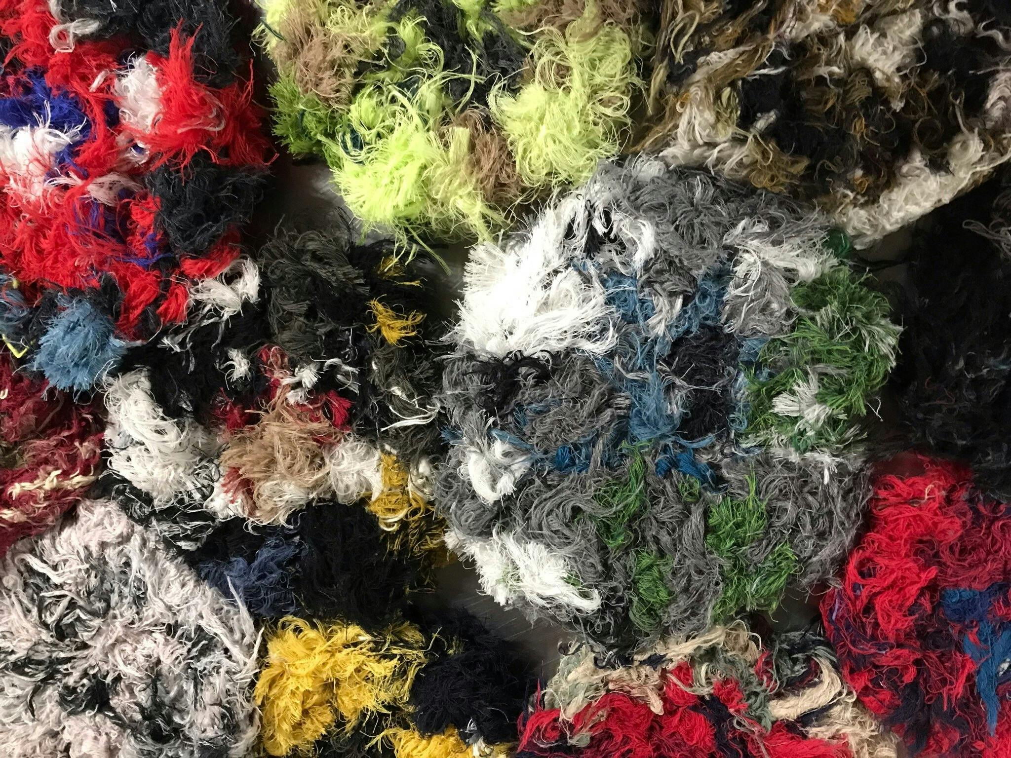 レピア織機で織られたカラフルな生地の耳を使って編んだ「もけもけ」。 素材は2種類、cotton100%の作品と、wool70% cotton30%の作品がございます。天然繊維のもけもけっとした、なんともにくい表情の 丸い物。 生地の耳は、本来捨てられる部分。ステキな耳を捨てるのがもったいな くて、試行錯誤を重ねて今のもけもけにたどり着きました。