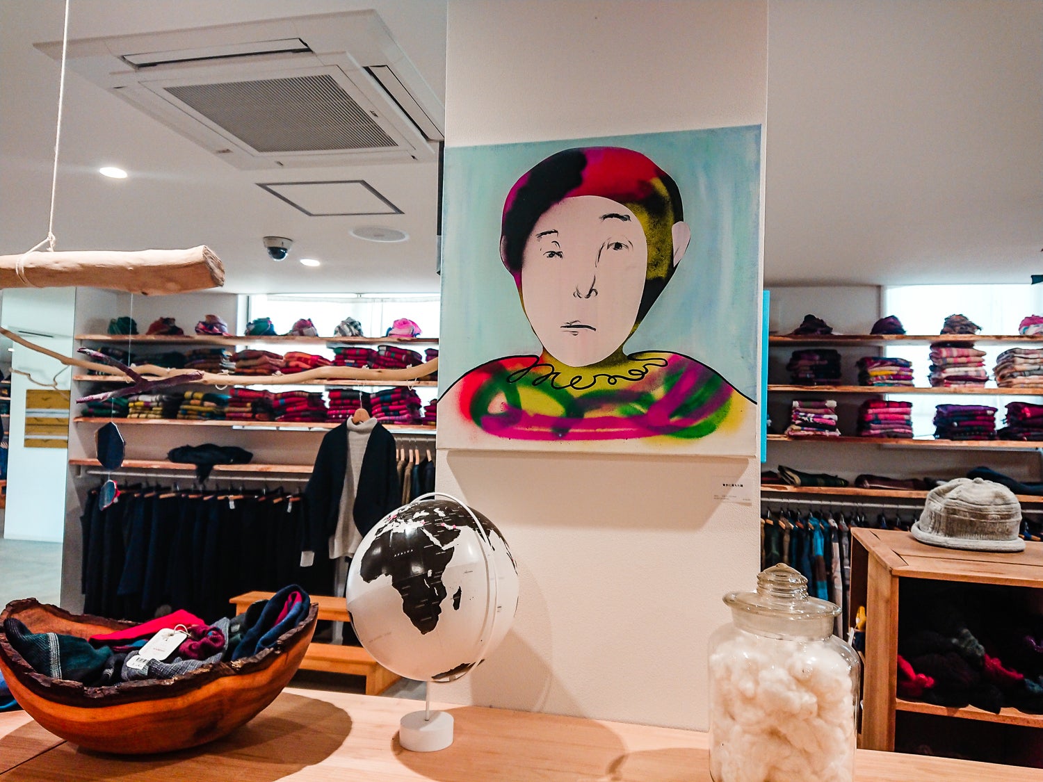 一歩建物の中に入ると、そこは素晴らしく素敵なShopでした。白ベースのシンプルかつ木など自然がふんだんに取り入れられ、tamaki niimeさんのカラフルな商品が非常に映えるディスプレイ。スタッフが描いたという絵も多く飾られていて、モダンかつスタイリッシュなtamaki niime worldにすぐに魅了されました。