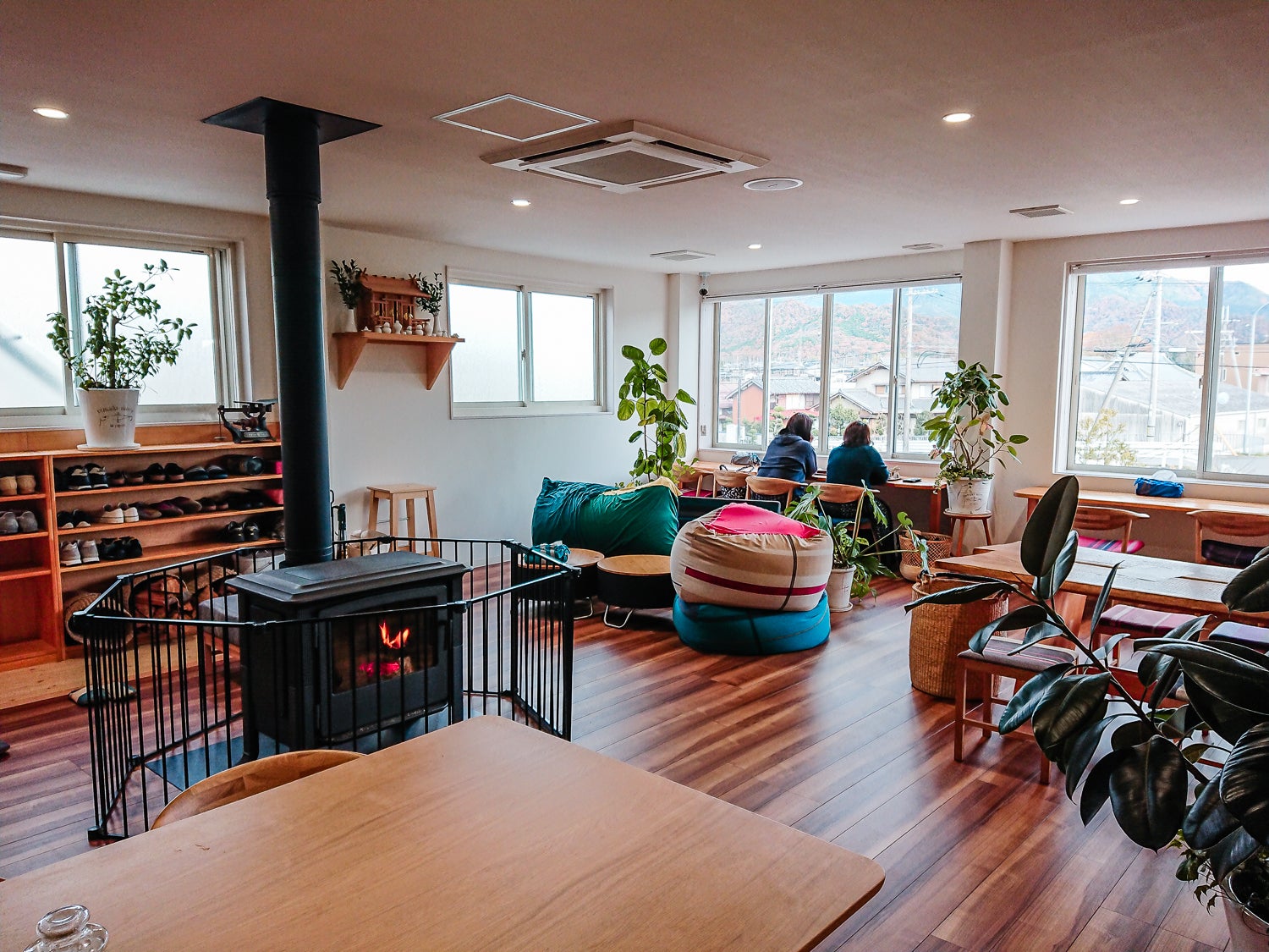 到着がランチタイムだったので、まずは2階のカフェにてランチを頂きました。ヴィーガンのビュッフェランチは、多種多様なお野菜が沢山食べられて大満足。カフェの中も木製の家具、シンプルな内装、スタッフが描いた絵が飾られ、暖炉があり、とても居心地の良い空間です。ここの雰囲気は、なんだか北欧を思い出しました。