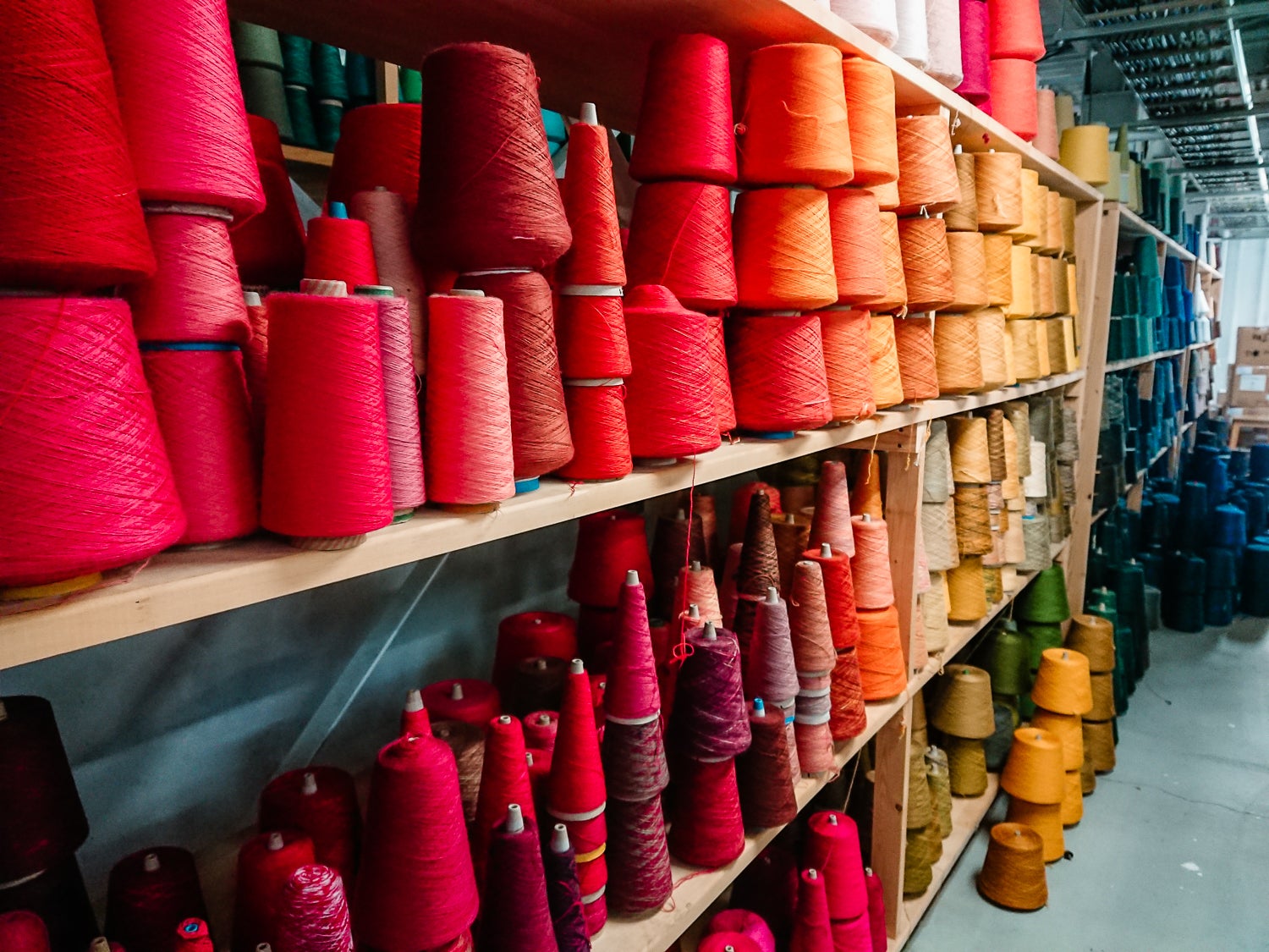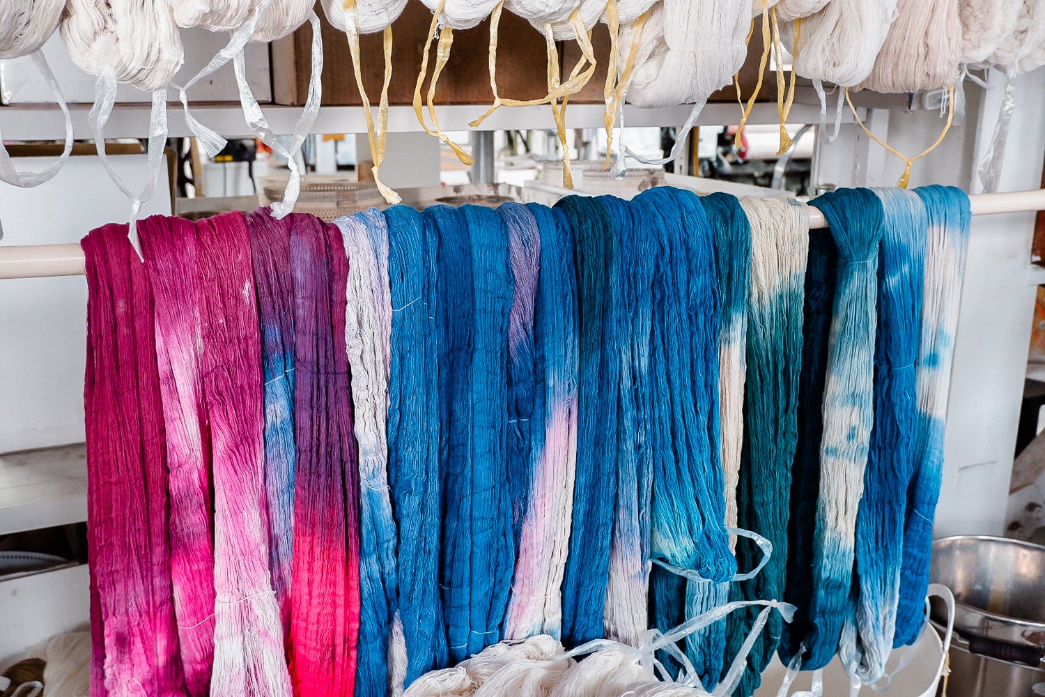 次は染色エリアへ。染料を様々な割合で調合しながら、毎日カラフルな糸を染色しています。染色する機械は思ったよりコンパクト。高圧な機械なので、かなり頑丈そう。一つの色で1束しっかり染めるもの、色を抜いたり他の色を入れ2色で染色する束もあり。tamaki niimeは多彩な色で糸を染色し、その糸で織ることにより、独創的で世界に1つしかない、オンリーワンな織物を作り上げている。