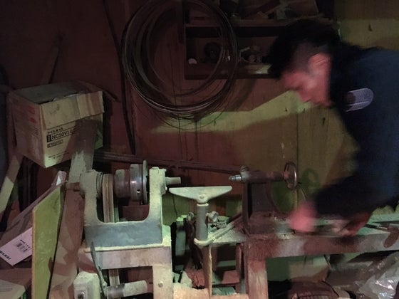 この旋盤はかなり年期が入ってるようで彼が見たことのある旋盤の中でも最も古い機材だそうです。旋盤自体はかなり古いものですが、問題なく使えるとのことで、削る刃物も手入れをすれば全然使えるようです。