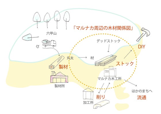 マルナカ工作所が「六甲山の木でモノづくりができる拠点」となるためになくてはならない存在があります。そのひとつが、六甲山で切り出してきた丸太を製材している「三栄」です。 ↑「三栄」の作業場の様子 ↑製材の様子 「三栄」は、創業以来80年にわたり、丸太の製材から家具に至るまで、さまざまなアプローチで木材に携わり、内装用/外装用、針葉樹/広葉樹、国産材/外材を問わず、多種多様な形で木材および木製品を取り扱ってきました。カリン、チーク、ナラ、タモ、ウォルナット、ニヤトー、ラワン、ブビンガ、マコーレ、米杉、スプルース、米松など、豊富な在庫品があるうえ、長年の間に培ったノウハウと独自ネットワークにより、あらゆるニーズに応えることができます。材料の供給にとどまらず、木材の特性に適した使用方法の提案および加工に関するアドバイスといったサポートもおこなっています。 ↑味のある表情を見せる製材された木材 製材スペースと併設される形で「北の椅子と」があります。「北の椅子」とは、北欧のビンテージ家具および雑貨を買い付け、輸入、リペア、そして販売をおこなうお店です。もともとは製材所だったおおらかな空間に、たくさんの家具や雑貨が展示されています。喫茶スペースでは、ショップで取り扱っている家具や食器を実際に体験できます。気分転換にランチでも食べに行こう、となったとき、私たちのなかでまず候補にあがるのが「北の椅子と」です。そのため、「北の椅子と」に行くと、必ず数人の知り合いと会い、近況報告をし合うことになります。私たちにとって、「北の椅子と」は地域のコミュニティ拠点となっています。 ↑「北の椅子と」の雑貨販売スペース ↑「北の椅子と」の喫茶スペース ↑左の入口が「三栄」の作業場、右の入口が「北の椅子と」 株式会社 三栄http://www.sanei-kobe.co.jp/index.htmlhttps://www.facebook.com/sanei.kobe 北の椅子とhttp://kitanoisu-to.comhttps://www.facebook.com/kitanoisuto/