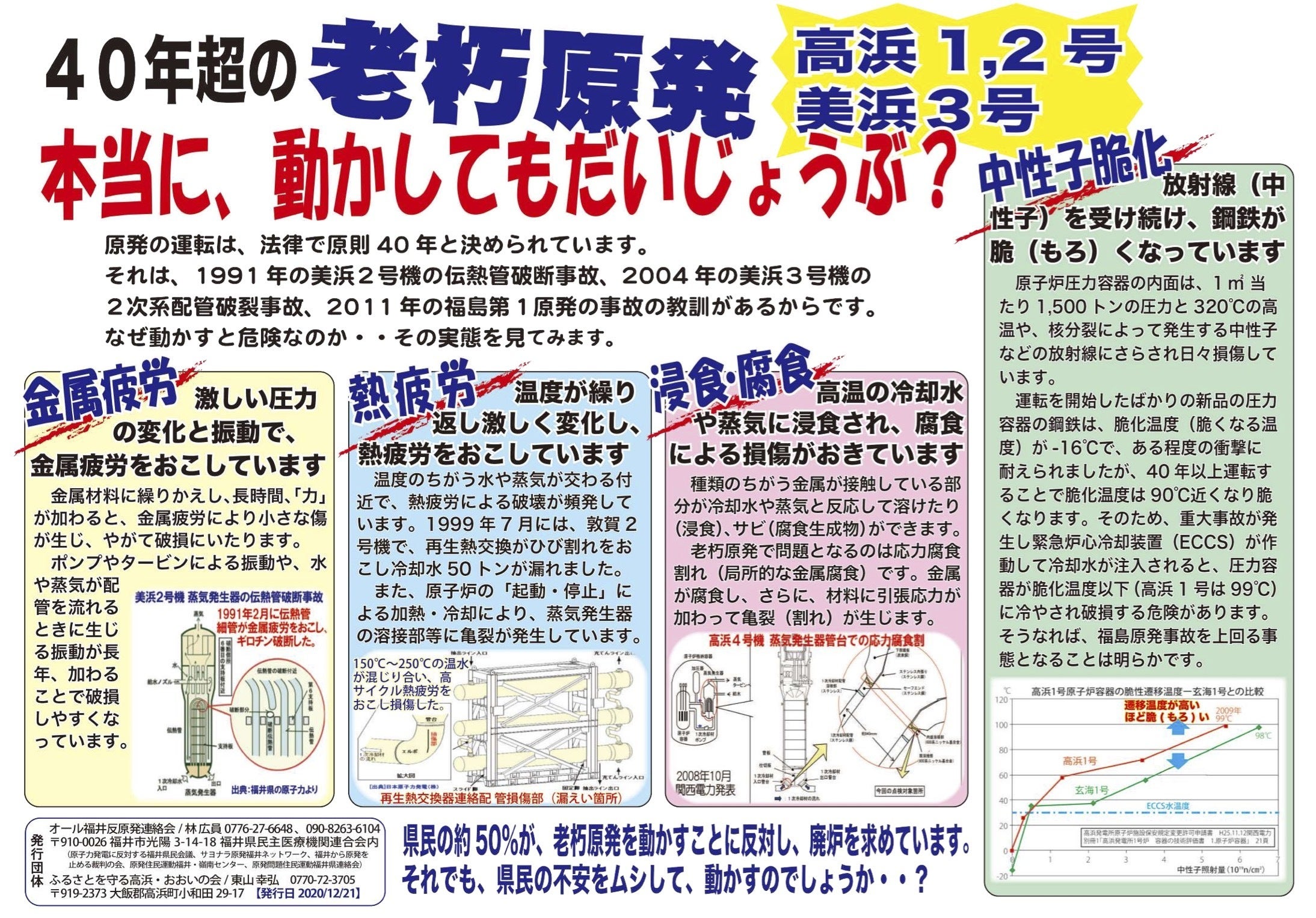 日頃のご支援に感謝申し上げます。昨日、関西電力が10/23からの美浜原発3号機の定期検査について発表しました。関西電力 https://www.kepco.co.jp2021年10月21日美浜発電所3号機の定期検査開始についてhttps://www.kepco.co.jp/corporate/pr/2021/pdf/20211021_1j.pdf「今後の予定 原子炉起動、臨界:2022年 10月中旬 調整運転開始:2022年 10月中旬 本格運転再開:2022年 11月中旬」 としています。 40年廃炉訴訟市民の会は、関電が美浜原発3号機を停止する予定の明日10/23に、このまま廃炉!を訴えて街頭アクションを行います。老朽原発このまま廃炉!キャンペーン10/23(土)美浜原発このまま廃炉 名古屋アクション!気候変動を言い訳に老朽原発うごかすな ちらしなど https://bit.ly/3kDs10Q2021年10月23日(土)14:00~15:00名古屋・栄 ラシック西側歩道小雨決行 マスクの着用をお願いいたしますプラカードは用意しますが、プラカードご持参歓迎 関電は、6月23日に美浜3号機の原子炉を起動しました。40年超の老朽原発として全国初めての再稼働です。しかし、10月25日の特重施設(テロ対策のための施設)設置猶予期限に間に合わないので10月23日には停止するとしていて、たった4ヶ月の運転を強行した形です。 私たちは、「老朽原発うごかすな!」という声を地元・福井や関西の仲間と共にあげてきましたが、美浜原発が再び停止するこの日、「老朽原発このまま廃炉!」を訴えて街頭でアピールしたいと思います。 皆様のご参加をよろしくお願いいたします。▶COP26(第26回気候変動枠組条約締約国会議)が、10 月31 日~11 月12 日に英国・グラスゴーで開催予定。▶2021年9月からパブコメが始まった第6次エネルギー基本計画(案)では、2030年の電源構成で自然エネルギーを36~38%、原発を20~22%に。2020年の原発比率はたった4%くらいなのに。5倍に増やすとなれば40年超の老朽原発もどんどん動かす前提。これのどこが「安全最優先」?▶「気候変動を言い訳に老朽原発を動かすな」との声を合わせて、「脱原発」も「脱炭素」も実現させる政治へと変えていきましょう!お知らせ「老朽原発このまま廃炉!大集会inおおさか」と き:12月5日(日)13:00 デモ出発14:30ところ:うつぼ公園(大阪市西区)主 催:老朽原発うごかすな!実行委員会(木原 090-1965-7102)https://blog.goo.ne.jp/takahamakarakanden/e/737ee8441673734839d1f38592c56096