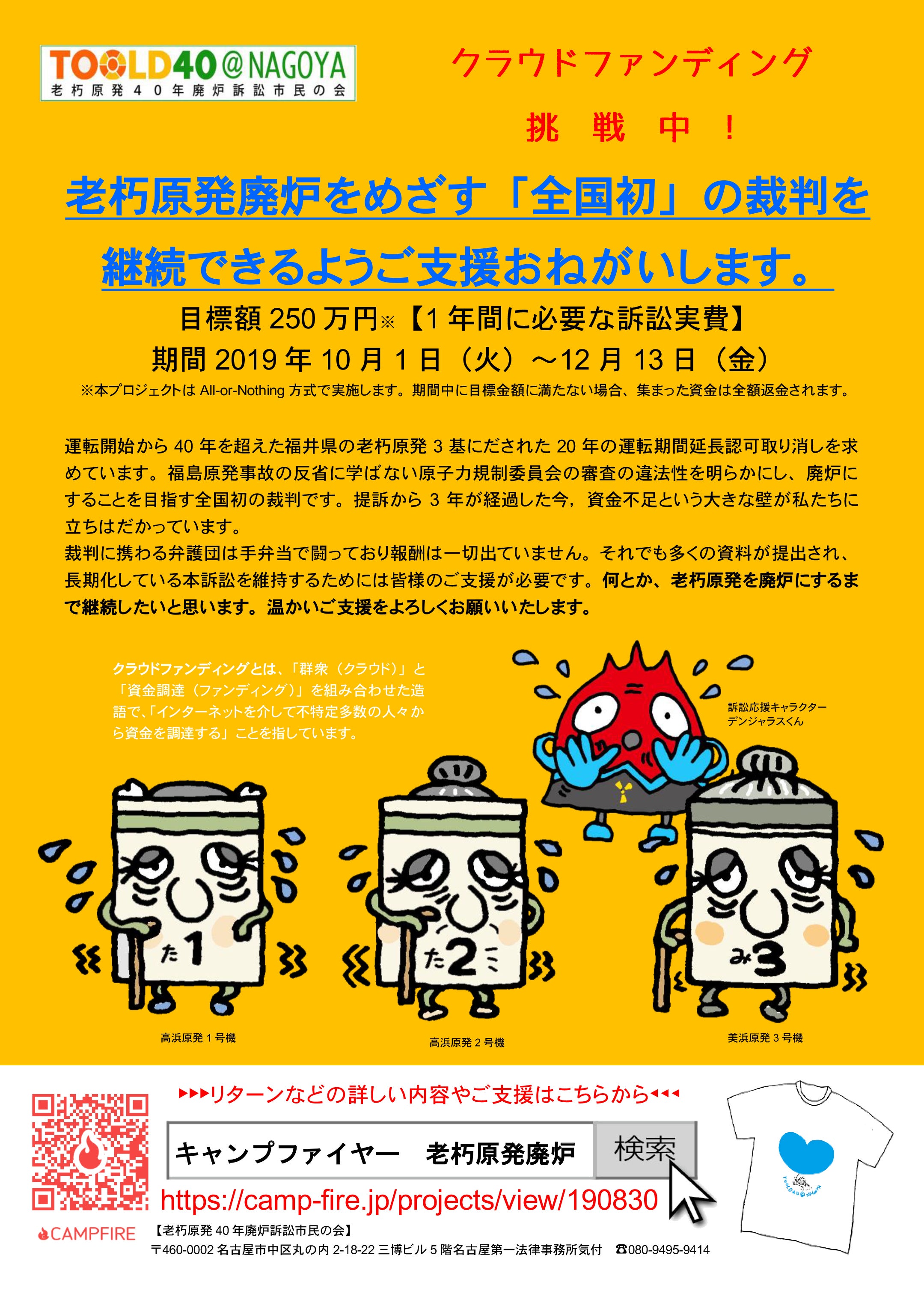 クラウドファンディング3日目となりました。 お申し込みやメッセージに大変励まされております。ほんとうにありがとうございます! この取り組みを広く知っていただくため、また、ご支援の方法をわかりやすく説明するため、ちらしも作製いたしました。 ご連絡くださいましたらお送りさせていただきますので、お知り合いにお渡しいただいたり、お店などに置いていただけませんでしょうか? また、集会などでの配布、ニュースレターへの同封などもお願いできればと思います。 お願いばかりで誠に恐縮ですが、どうぞご協力をよろしくお願いいたします! ちらしについてのご連絡は、老朽原発40年廃炉訴訟市民の会まで。 TEL:080-9495-9414 E-mail:toold40citizens★gmail.com(★を@に代えて送信してください) *ちらしは近日中にホームページに掲載し、ダウンロードしていただけるようにいたします。