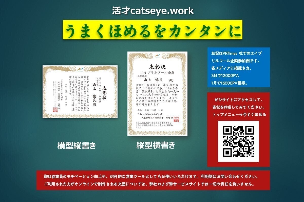 「活才catseye.work」は、表彰状をオンラインで作成し、「うまくほめる」マニュアルとともに企業の生産性向上を支援するサービスです。