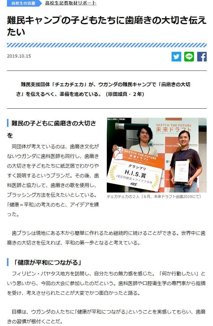 2019/10/18 21:28皆さんこんにちは。ChekaChekaです。ChekaChekaの活動が高校生新聞に10月15日に掲載されました!私たちの活動を端的にまとめてくださっているのでぜひ、見てみてください!Hello, everyone!Our project is on web news!Please have a look.( Unfortunately, the article is in Japanese).リンク / linkhttp://www.koukouseishinbun.jp/articles/-/5728ChekaCheka もっと見る