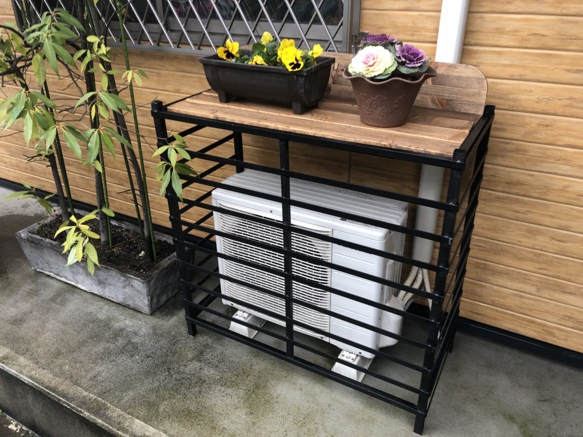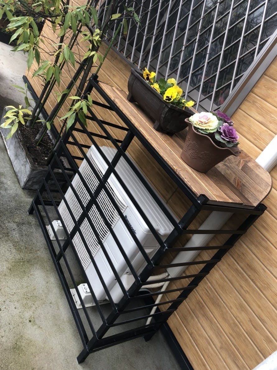 私の作品の中で1番人気のアイアン室外機カバーになります。夏場は強い日差しを避け、天板部には花やガーデニング用小物も飾って頂けます。