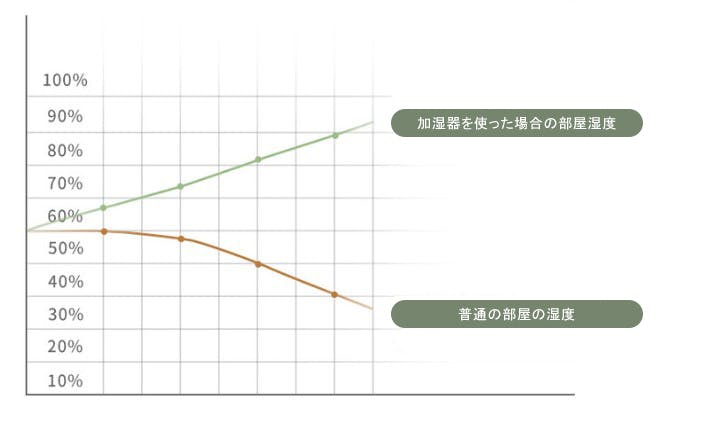 扇風機と加湿器の同時使用により、室温を早く下げる効果もあります。また、280ml/hの水の粒子が空気中のチリやほこりを落として、お部屋の空気をきれいにしてくれる効果も。