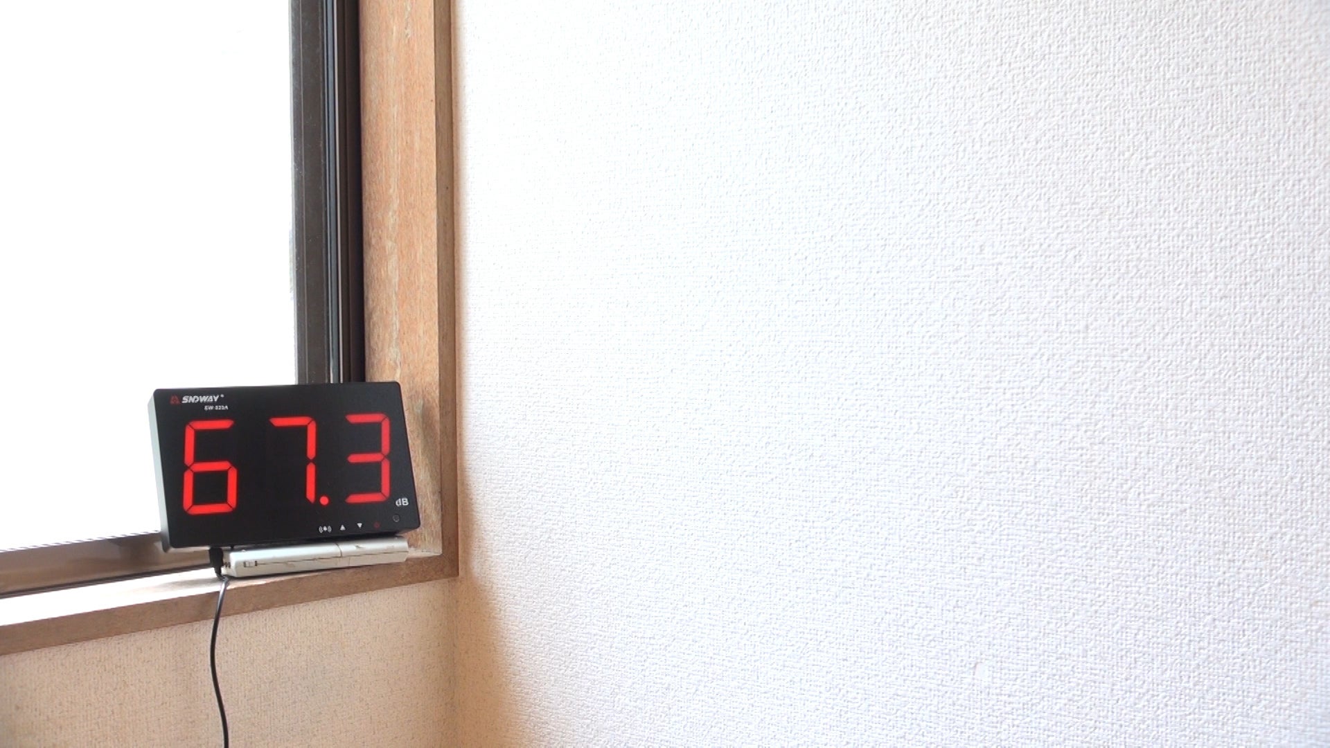 A、画像や動画で使用した機材は音量の測定と表示が一体となっている簡易な市販品です。その為、測定された表示もあくまで「参考値」としてご覧ください。振動音は低音域の為、動画中で聞き取りにくいことをご容赦下さい。