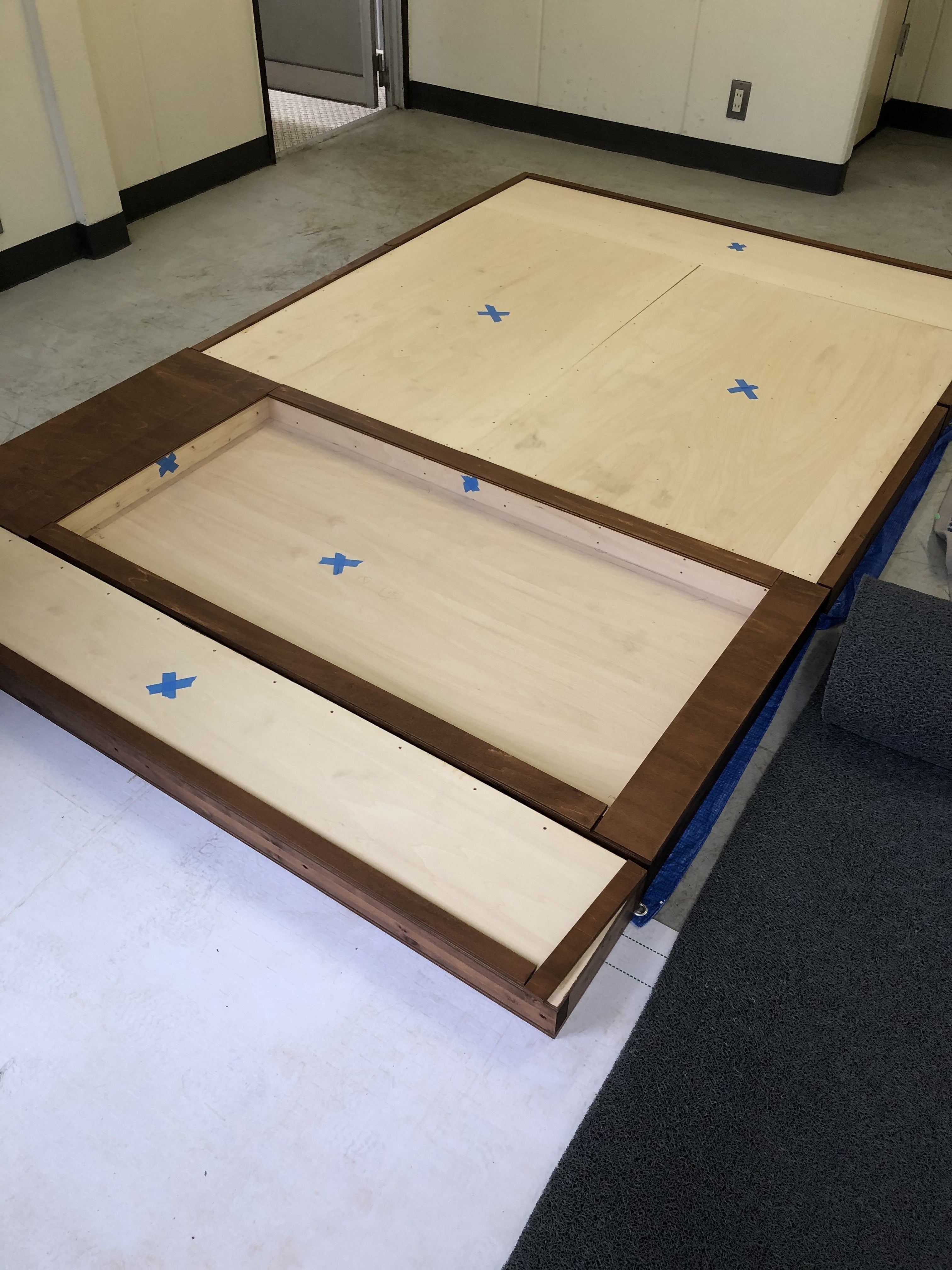 これから、カーペット仕上げと、支持台の筐体内「緩衝部材等」の組み立てです。予定では本日中に完成する予定ですが今も内部ボードの寸法調整や緩衝部材の変更、メッシュゴムシートの編み込み調整をしながら制作しています。