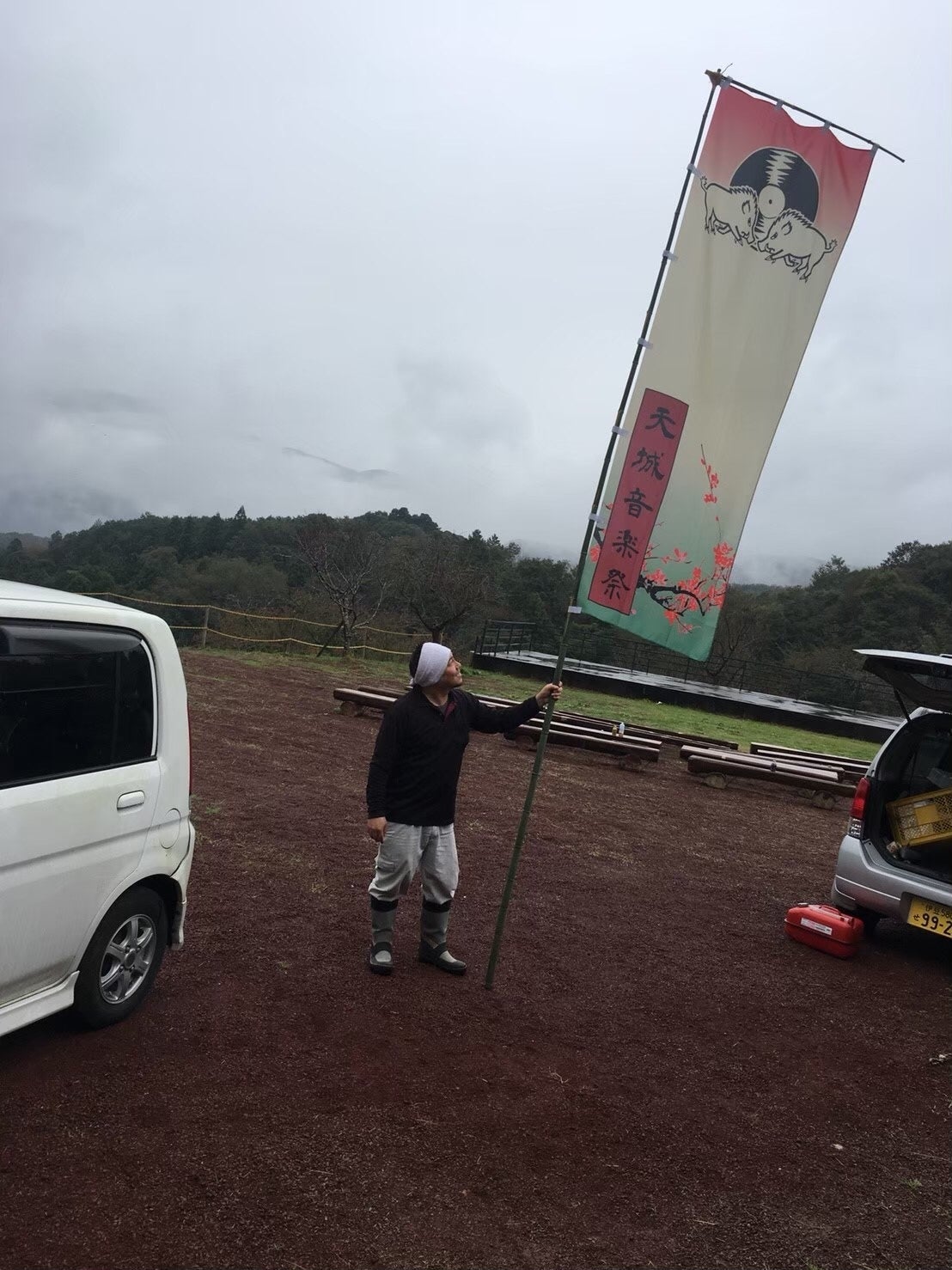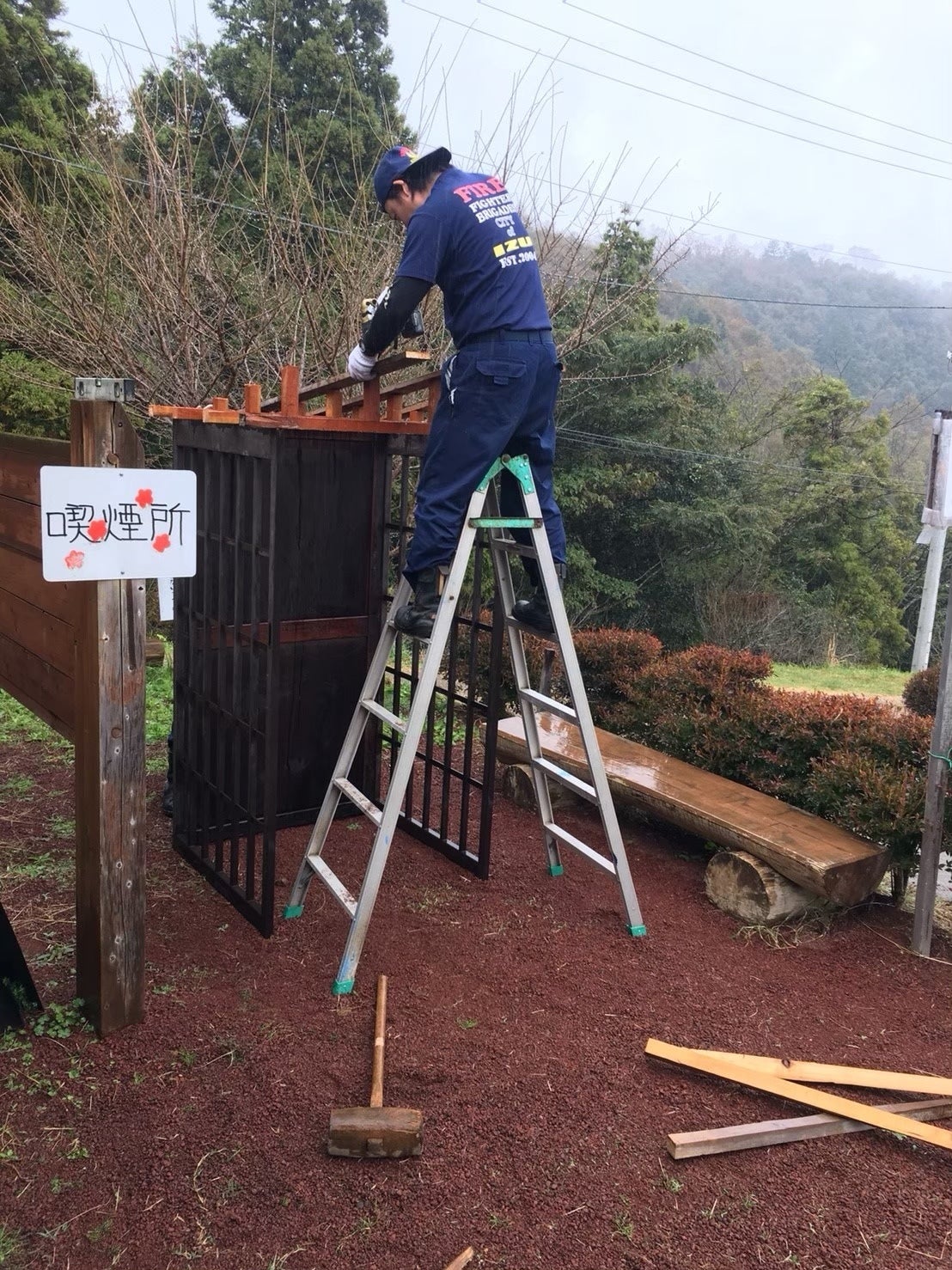 小雨の中での作業