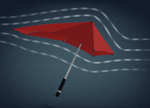 空気力学に着目した結果、傘は前方が短く後ろが長いという形状となり、それは強風を翼のように受け流すことを証明しました。長柄のSenz゜Originalは時速100km/h以上の暴風にも耐えられます。
