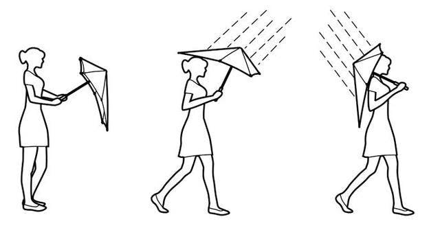 A1 頭が傘の中央になるよう、少し前に傾け加減で傘を持つと体の前面が濡れやすいということはありませんし、空力的にも安定します。