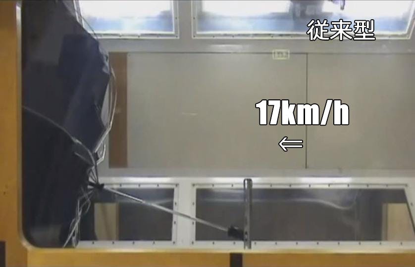 【風洞実験:右方向からの強風に裏返る従来の傘】