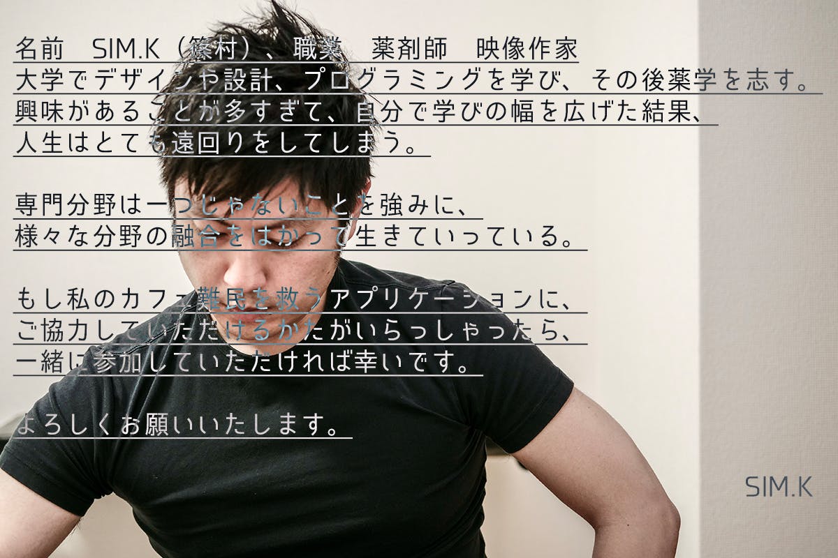 私は普段は薬剤師 件 フリー映像作家をやっております SIM.K と申します。プログラミングの経験は大学時代に少しあるものの、アプリ開発をしたことはありません。しかしアイデアだけはたくさん持っており、今回、カフェのアプリを開発したく、クラウドファンディングを始めました。