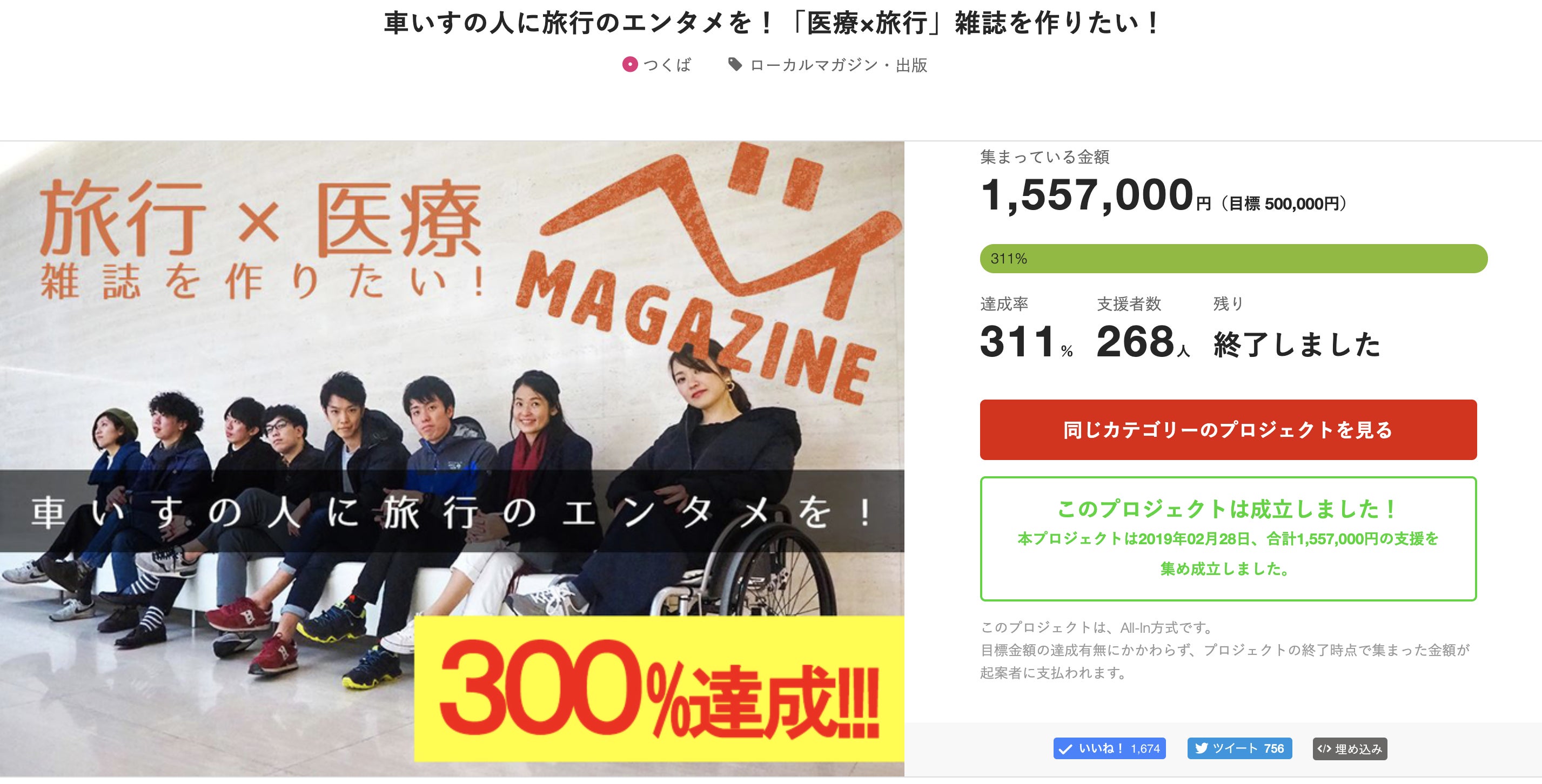1,557,00円、達成率311%、支援者数268人と多くの方にご支援いただきました。