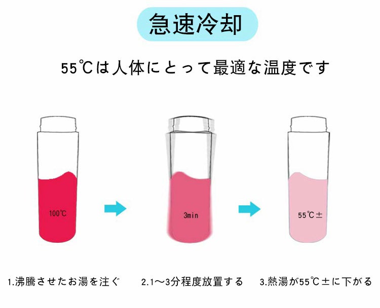 沸騰させたお湯を魔法瓶に注ぎ、1~3分程度放置すると、100℃の熱湯の温度が55℃まで下がります。