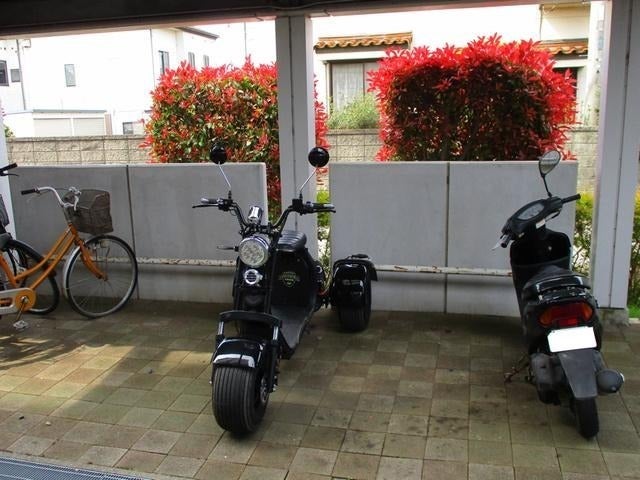 大きさは原付きの横幅がちょっと広くなった感じです(全長205cm、全幅100cm)。意外と、すっきり、原付き置き場や自転車置き場に収まります。