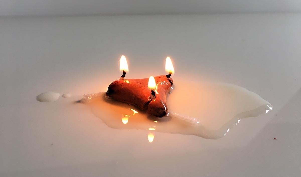 本体のベース部分は、特殊製法による陶器製(6g・一辺約3cm)。芯はススの出にくいキャンドル用糸芯を使用しています。