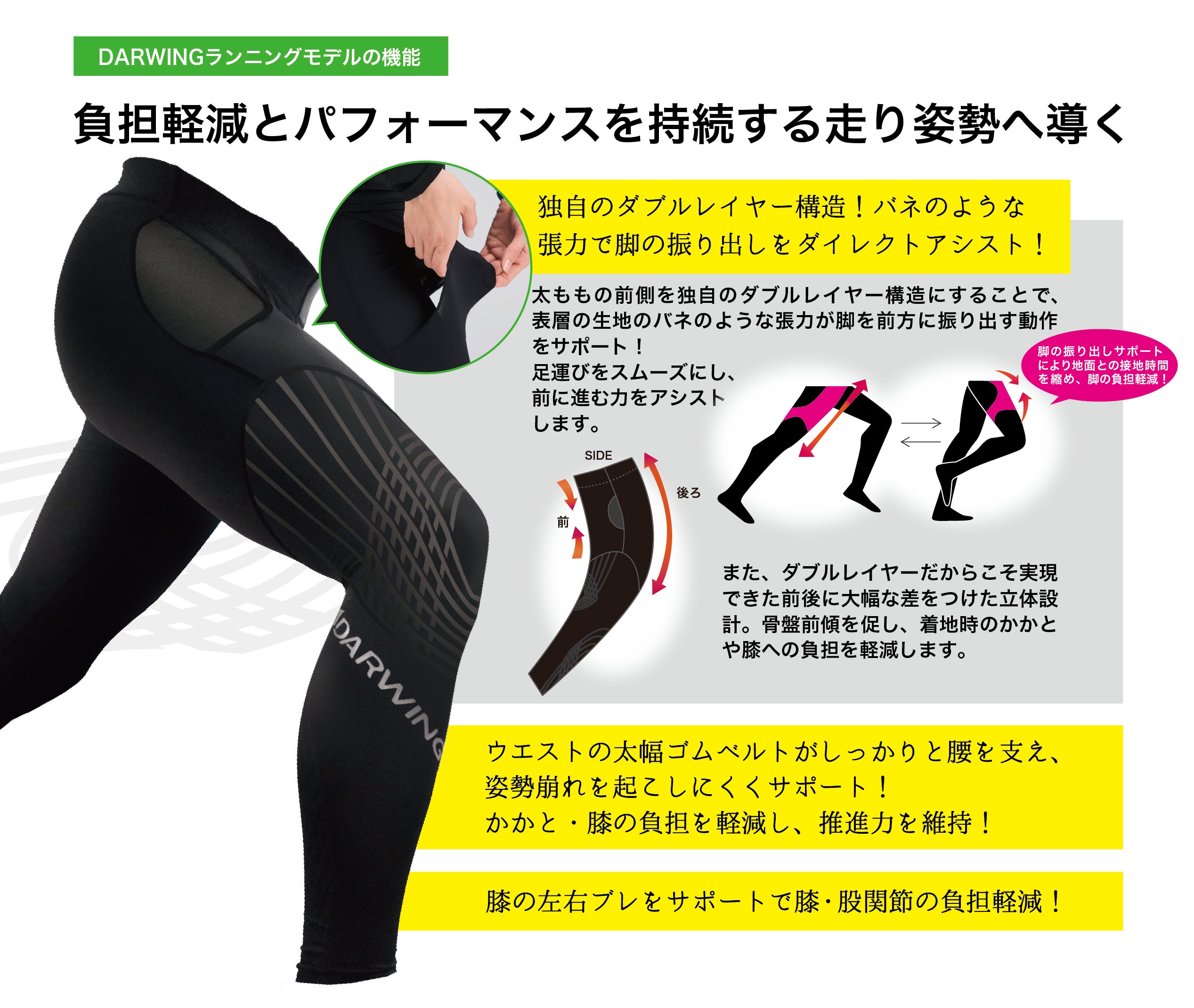 着目したのは人の身体の動きに不可欠な筋肉。いままで培ってきたサポーターの医学的ノウハウと伸縮と非伸縮を組み合わせるフィッティング技術により、筋肉の機能を模したダブルレイヤー構造のウェアや人工筋肉を搭載したアシストギアを開発製造しています。DARWINGはあらゆる動きの欲求に応え、人生の様々な挑戦を応援するため、進化し続けます。