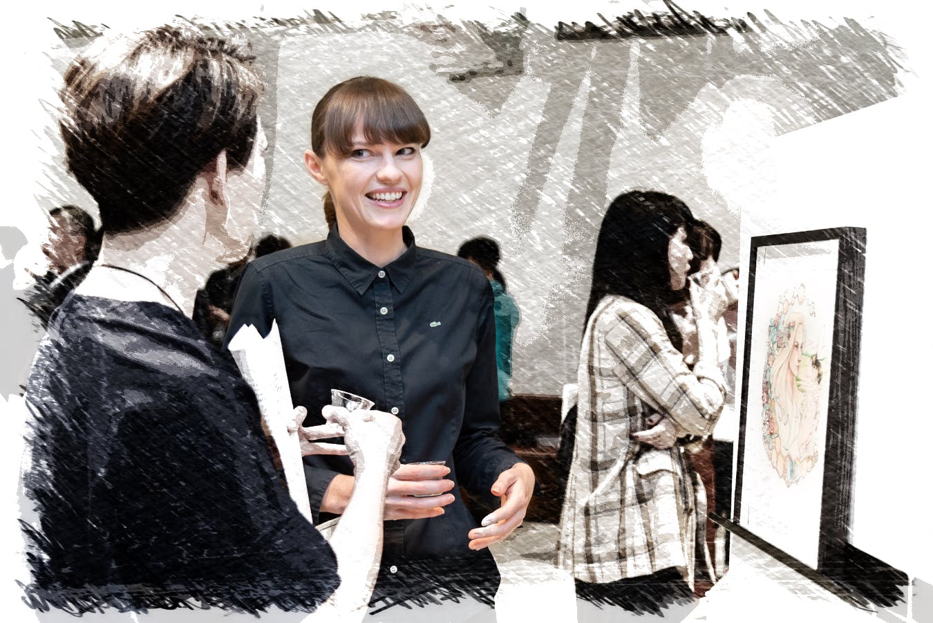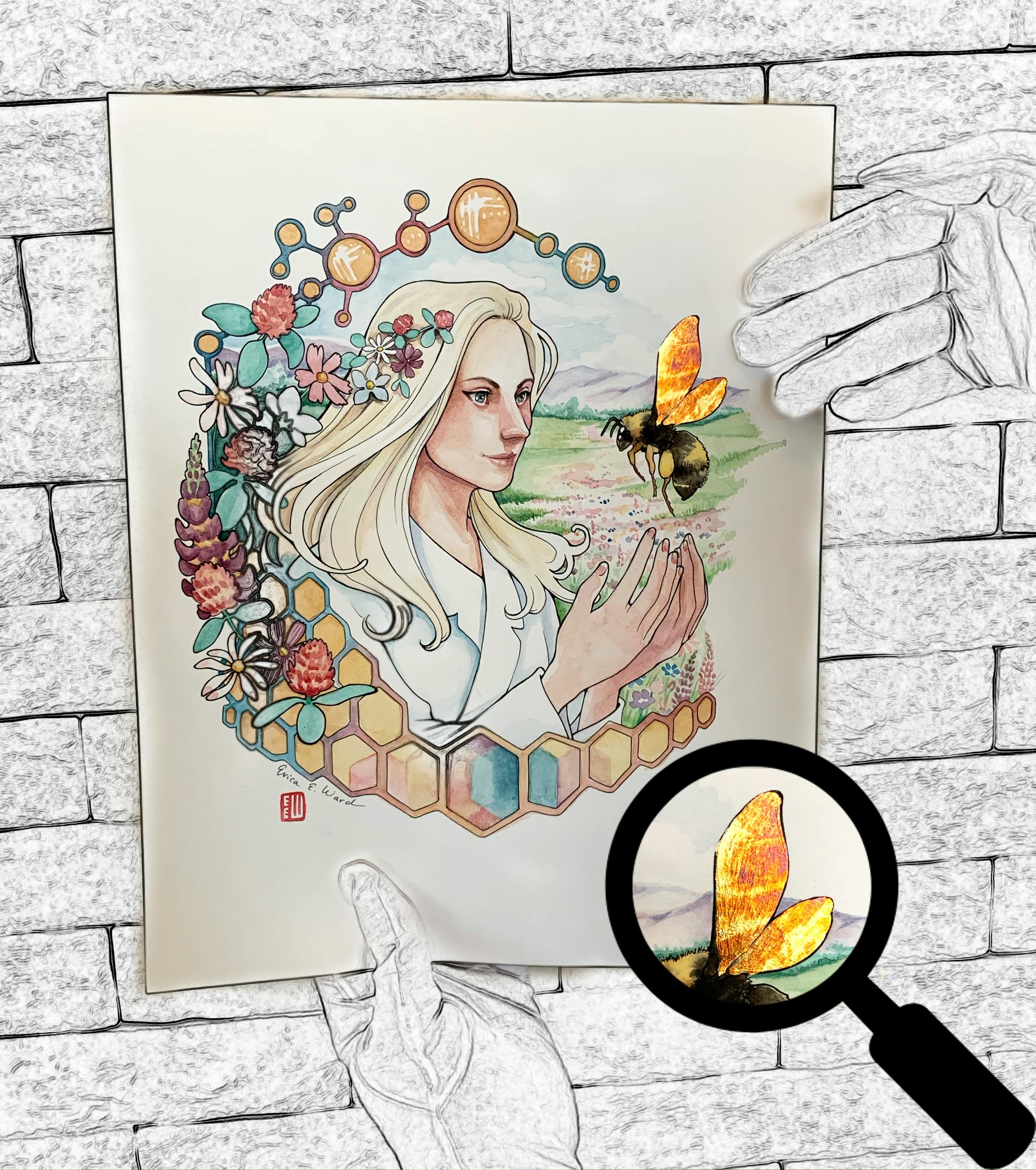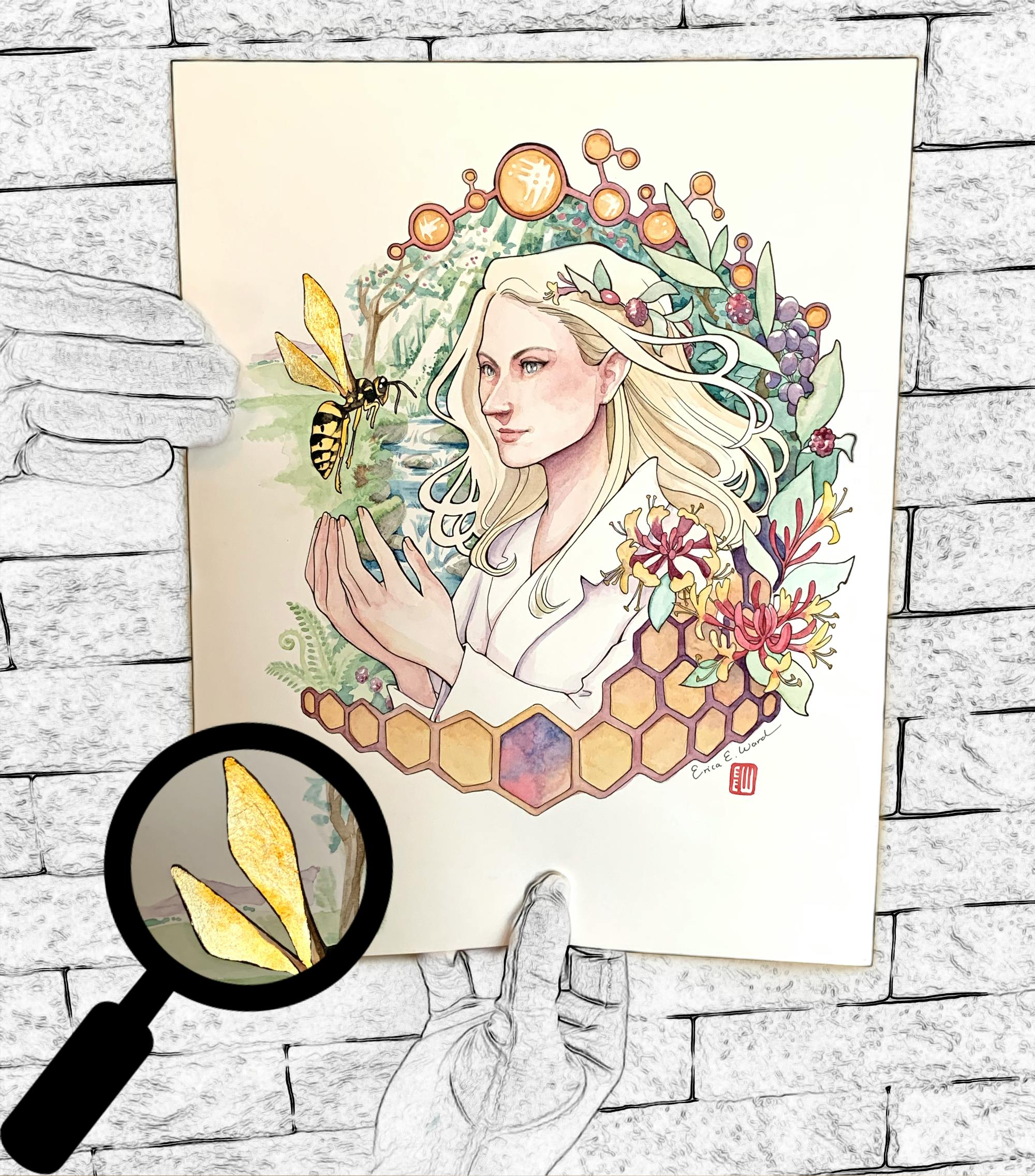 エリカ・ワード氏作のこれら限定原画は、日本酒やアートファンの皆様にお買い求めいただけます。小さく優れた生き物から採取した酵母から生まれた、世界初の日本酒を祝いましょう。コラボレーションの特別ボーナスとして、原画の縁には醸造家の亀岡晶子氏によってゴールドのギルディング (金属の薄い箔を付着させる) が散りばめられています。