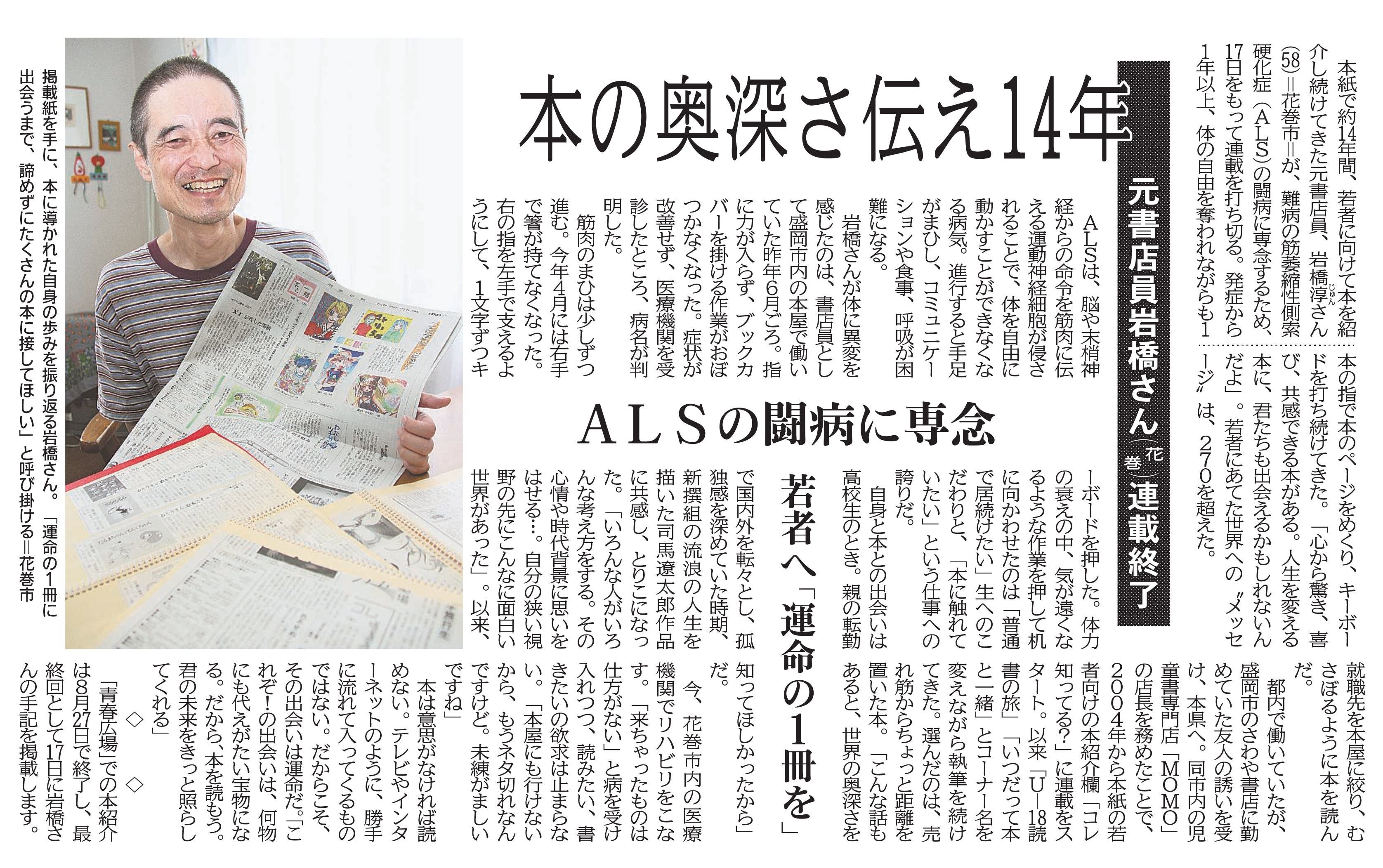 岩橋さんは2018年、難病の筋萎縮性側索硬化症(ALS)※の治療に集中するために、勤め先のジュンク堂書店盛岡店を退職し、岩手日報紙上での14年にもわたる長期連載「いつだって本と一緒」を終えたばかりでした。