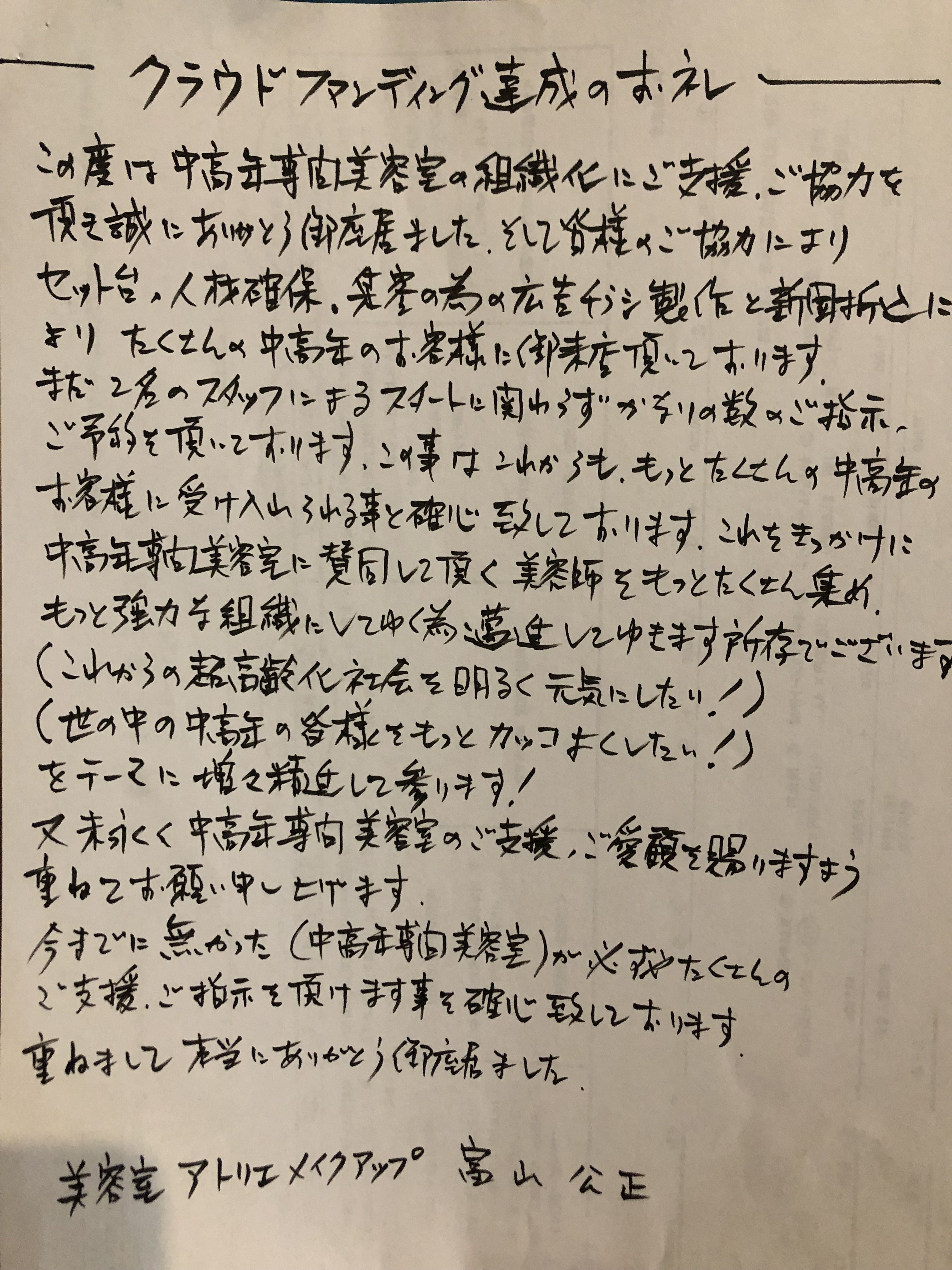 1953年生まれの66歳です。今回からクラウドファンディングで集めた資金で他美容室との差別化を図るべく中高年の為の専門美容室を実現・成功させたいと思い応募いたしました。