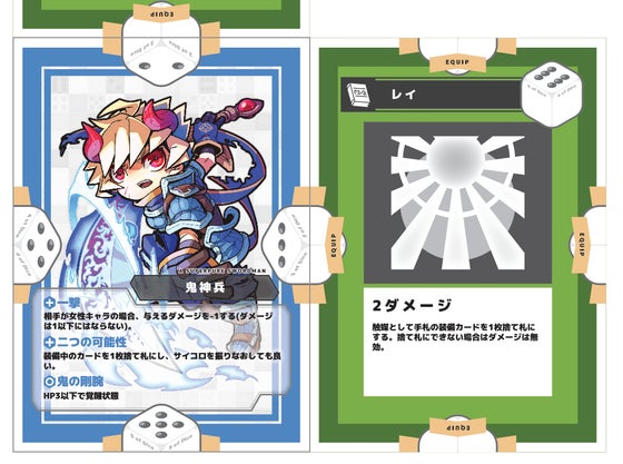 手持ちのカードをキャラクターに装備させ、サイコロを振り攻撃をして相手のHPを0にしたほうが勝ちというシンプルなルールです。
